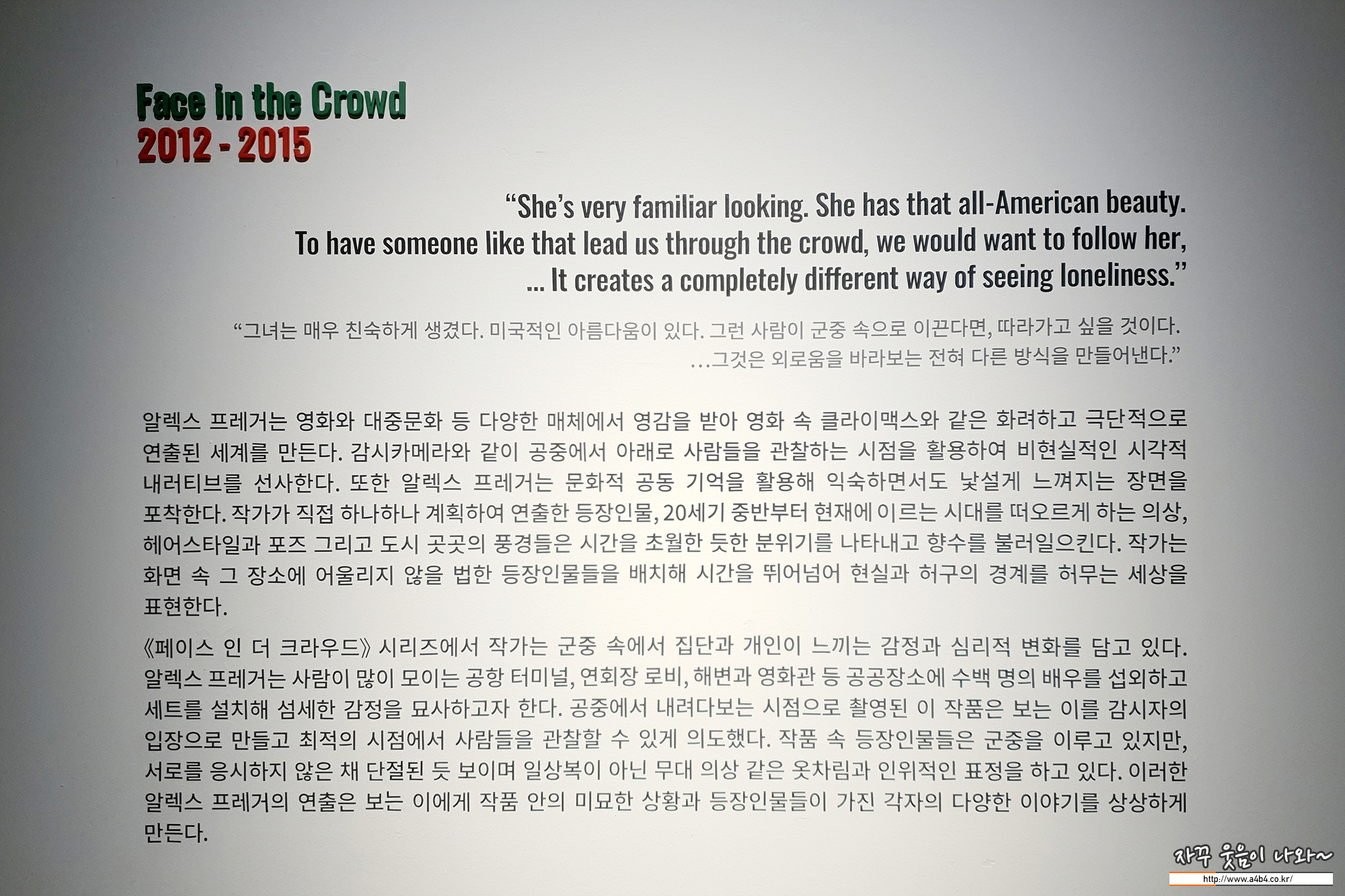 오랜만에 맘편하고 여유있게 전시회 다녀왔다는... 현재 상당히 많은 사진 전시회가 진행되고 있지만. 이번 알렉스 프레거 전시회는 기존과 다른 조금은 색다른 작품들을 만나볼 수 있는 기회가 아닐까...