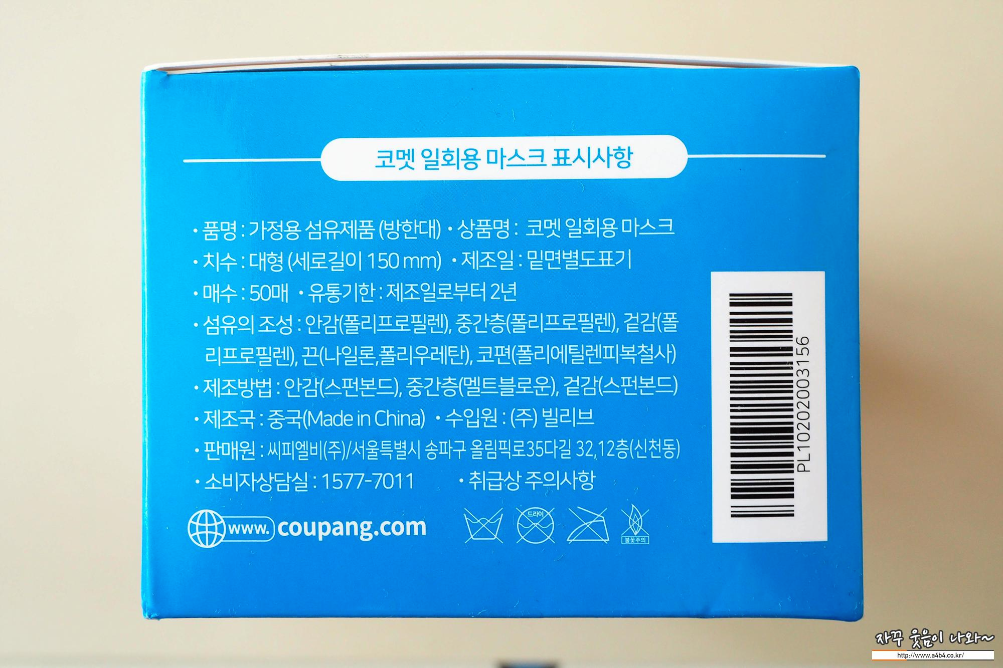 해당 제품은 공산품마스크로 식약처에서 관리하는 보건용마스크는 아닙니다. 보통 가정용 섬유제품 방한대로 불리는... 제품명은 '코멧 일회용 마스크로' 마스크 제조는 중국산제품입니다. 판매는 쿠팡 자회사이자 쿠팡 브랜드를 주로 취급하는 '씨피엘비'입니다.