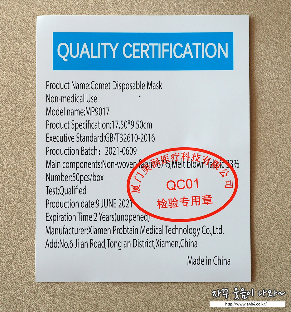 50매들이 박스제품 (벌크)으로 가격은 7,190원입니다. (로켓배송) 1매당 144원으로 예전보다 가격이 오른 것 같네요. 타사 중국산 마스크에도 있는 비슷한 모양의 보증서 아닌 보증서도 들어 있네요...