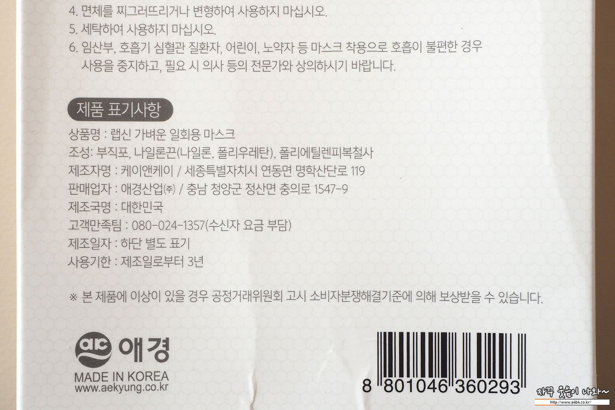 제품명은 '랩신 가벼운 일회용 마스크'입니다. 우리가 주로 사용하는 KF94, KF80, KF-AD 보건용 마스크나 덴탈마스크는 아닙니다. 식품의약품안전처 의약품안전나라에 등록정보 없는 일반 공산품마스크입니다. 마스크 제조는 보건용 마스크를 생산하는 '케이앤케이' 판매는 애경산업 주식회사입니다.