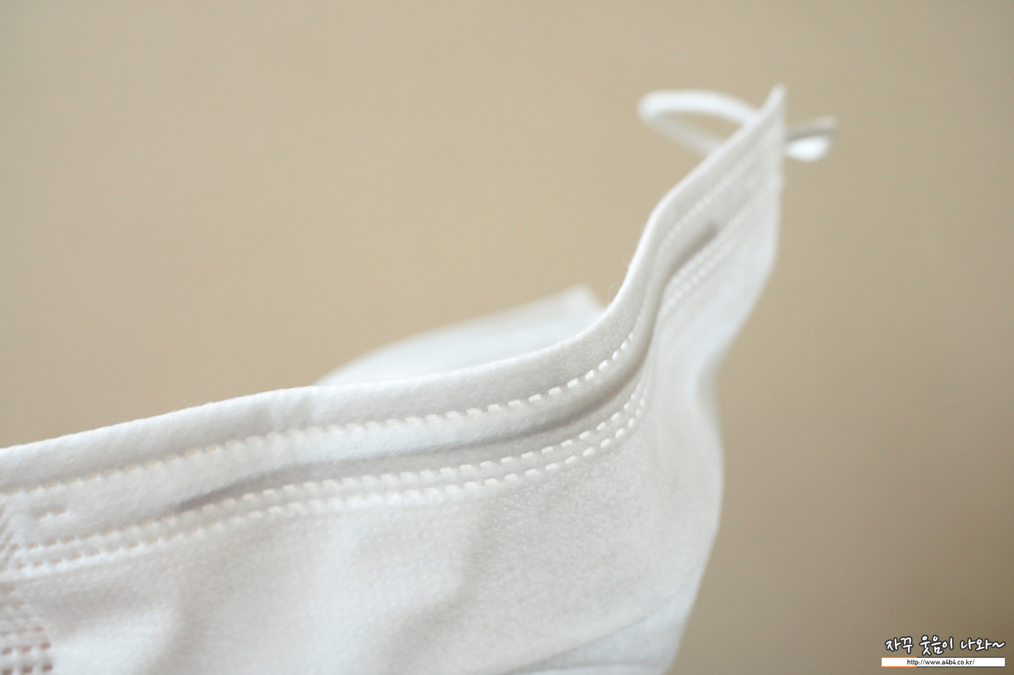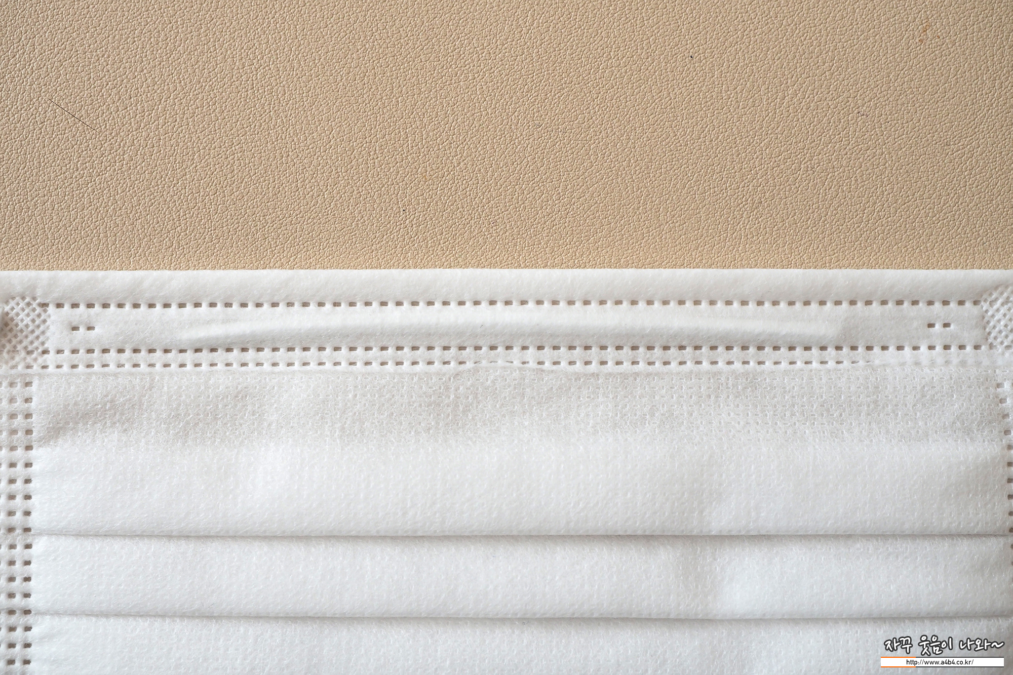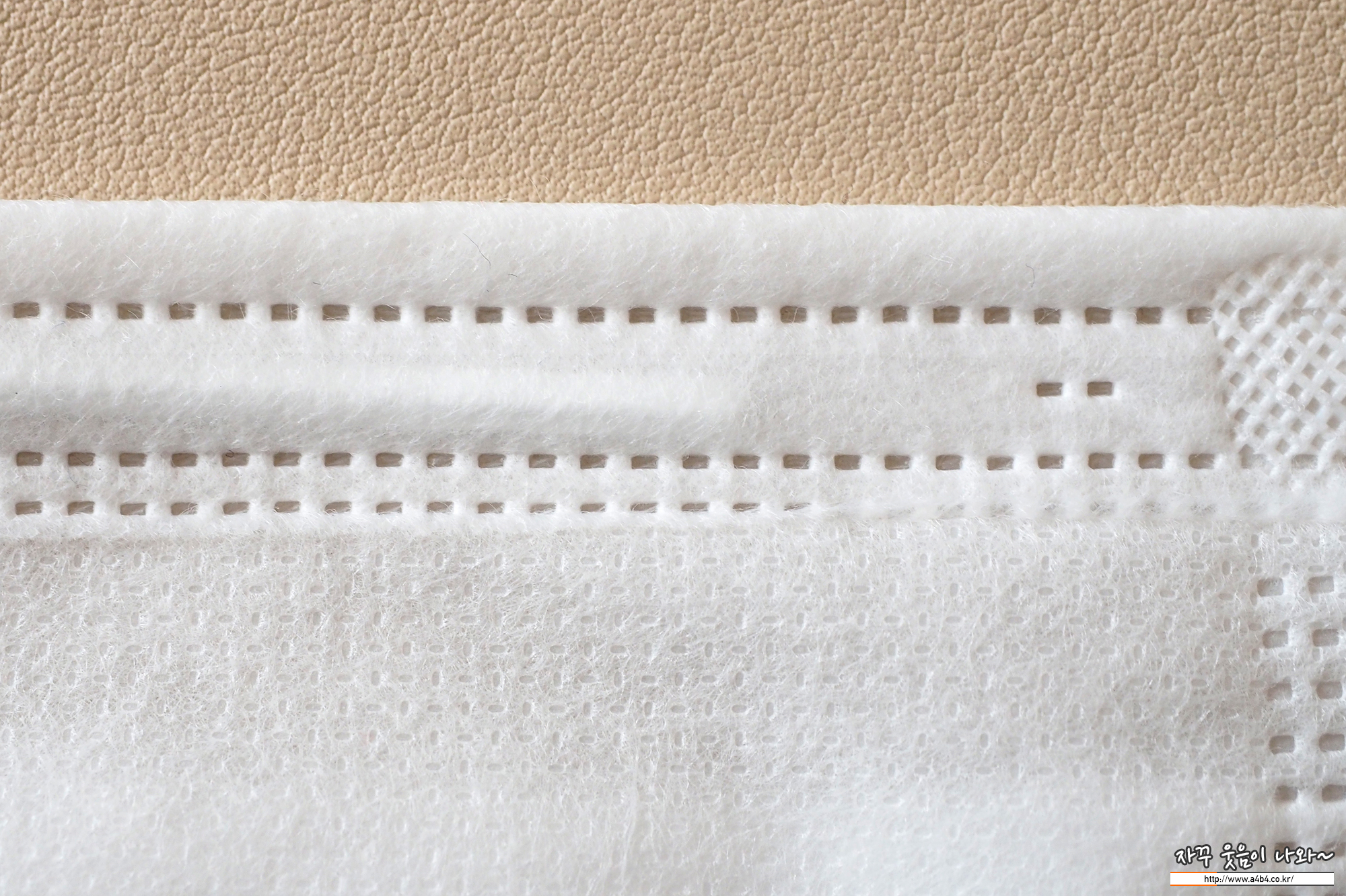 마스크 외피은 약간의 질감이 느껴지는 조금 까끌한 감촉을 보입니다. (착용에 불편은 없음) 두께는 일반적인 덴탈마스크 수준인데 얼굴 비침이 조금 있는 제품입니다.
