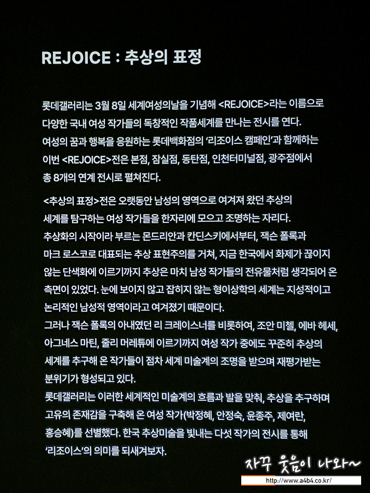 오늘 소개할 Rejoice 추상의 표정 전시회에 대한 간략한 소개는 아래를 참고하세요.