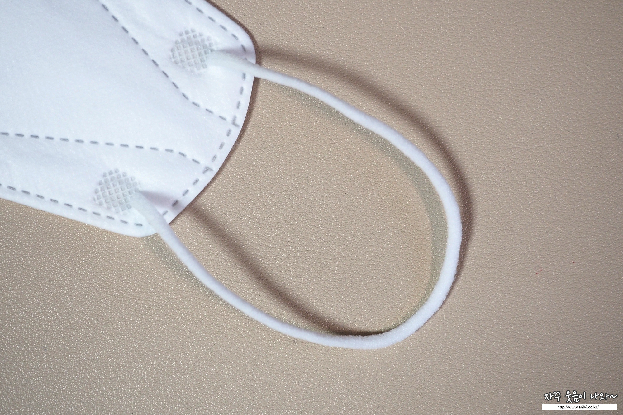 원형의 이어밴드가 마스크 앞부분에 접착되어 있으며, 상태는 양호합니다. 또한 이어밴드 탄성은 일반적인 수준입니다.