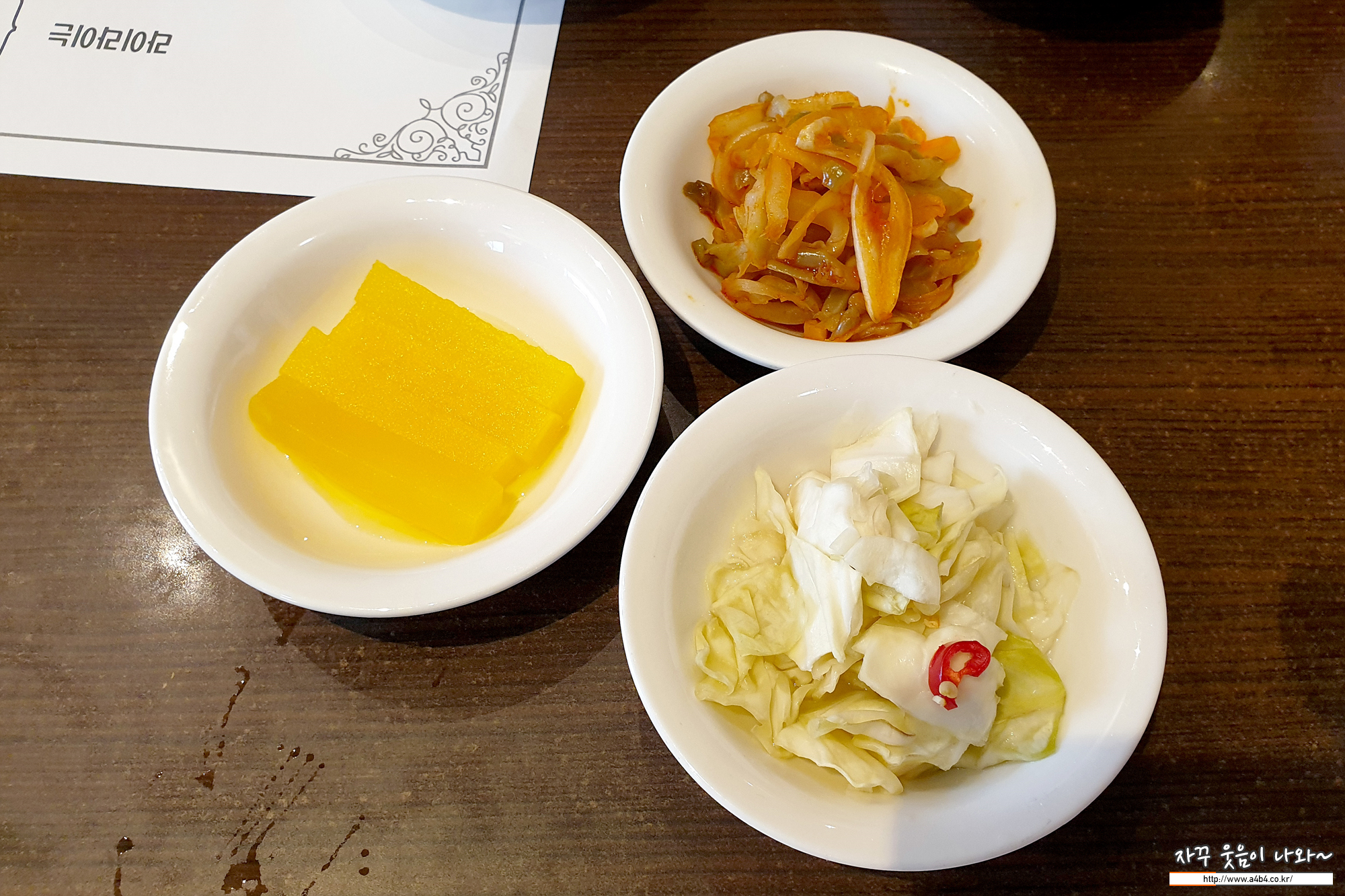 기본 반찬은 단무지와 짜사이, 양배추 피클이 나옵니다. 양파와 춘장은 별도로 말씀하시면 주십니다.