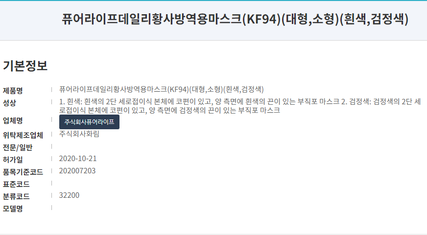 식약처 등록 제품명은 '퓨어라이프 데일리 황사방역용마스크 (KF94)'입니다. 우선 페키지에 표시된 '스윗홈 데일리 황사방역용 마스크'와 다른 이름이 등록되어 있습니다. 20년 10월 승인된 제품으로 마스크 제조사는 주식회사퓨어라이프, 판매원은 주식회사 스윗홈으로 등록되어 있습니다.