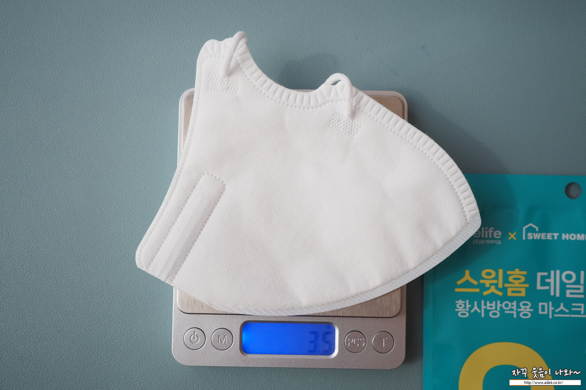 KF94 스윗홈 데일리 마스크 무게는 3.5g으로 새부리 대형 마스크 중에서는 매우 가벼운 타입에 속합니다. 또한 동일한 제품은 퓨어라이프 데일리 마스크와는 -0.5g 차이가 나네요.
