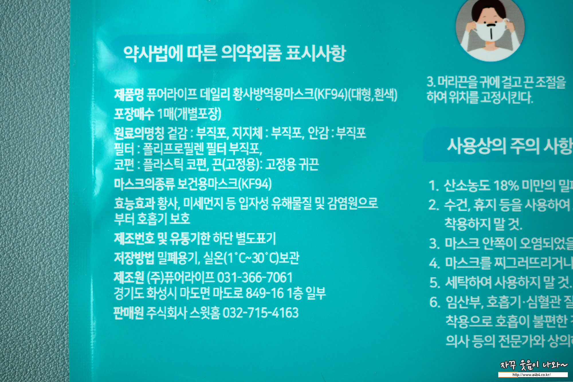 앞에서 말했지만, 스윗홈 데일리 마스크는 기존 '퓨어라이프 데일리 황사방역용' 마스크와 동일한 디자인을 보여주는 제품입니다. 식약처 등록정보도 동일한 것으로 알고 있습니다.