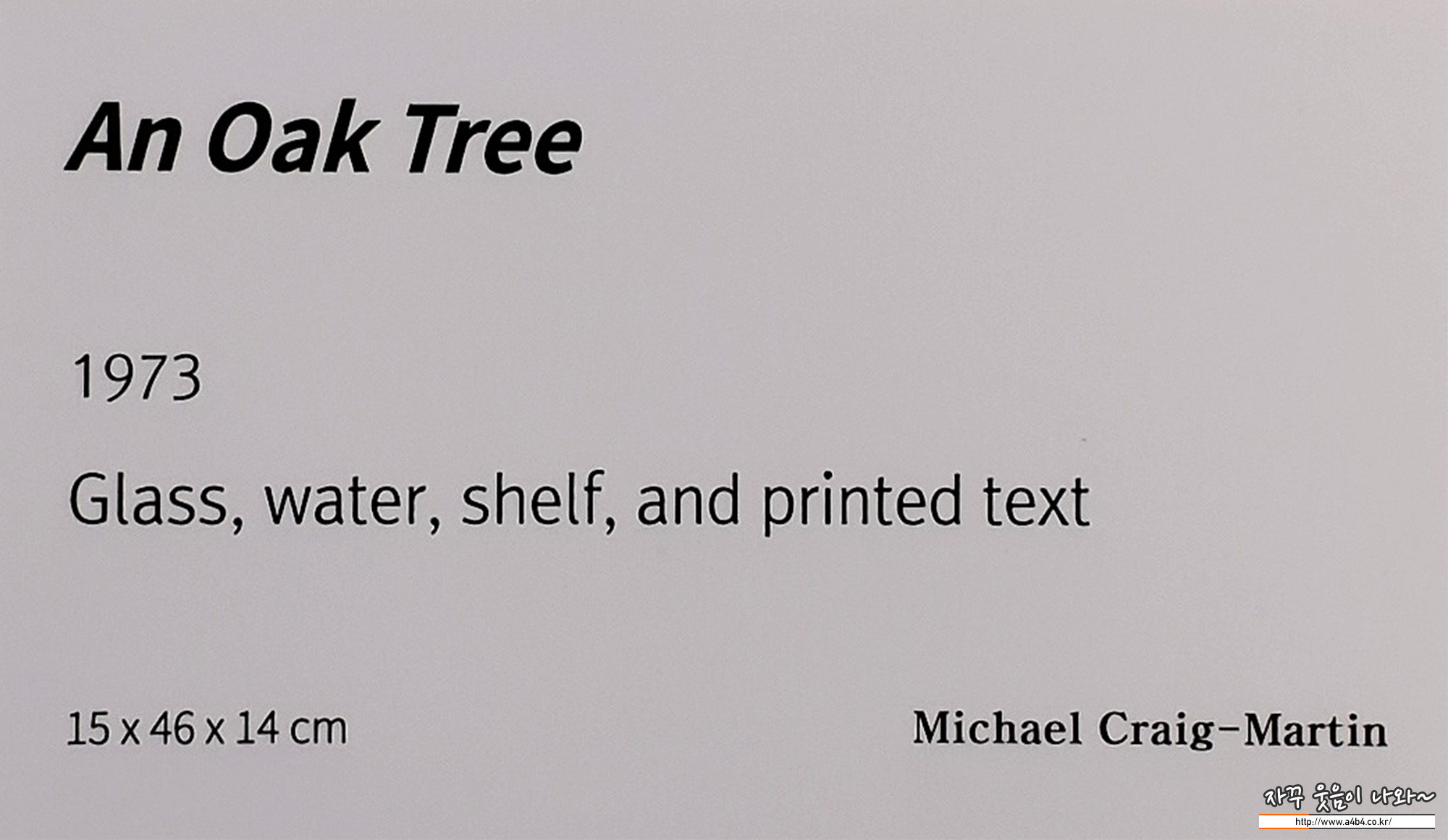 갤러리벽면에 ‘선반과물한잔’을 올려놓고 물컵이 아닌 참나무라고 명명한이작품은 개념미술사의 중요한 전환점 이됩니다.