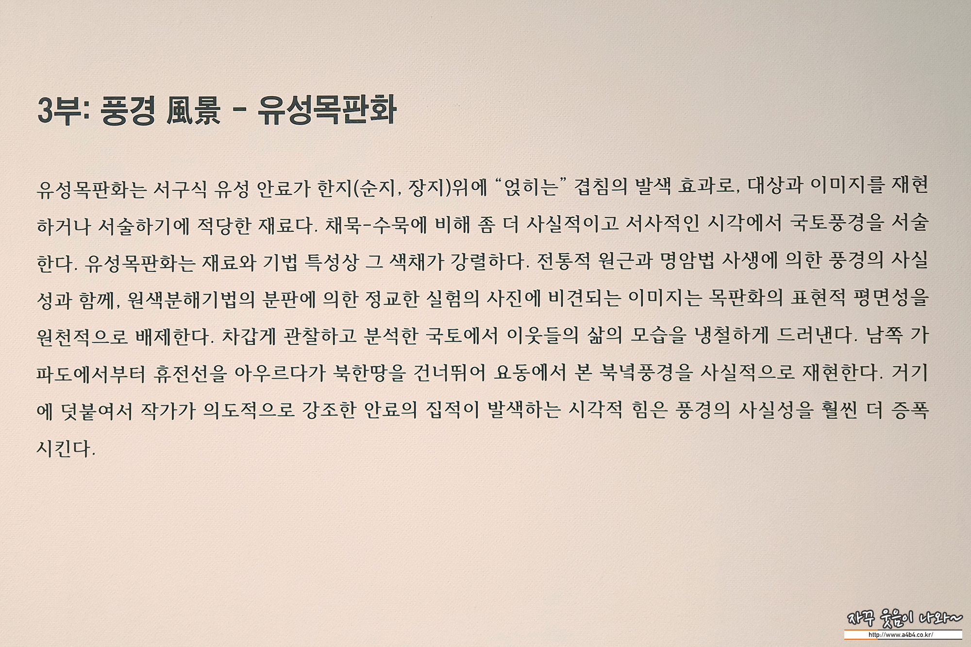 지금까지 채묵목판작품을 만났다면, 3부에서는 좀 더 사실적이고 강렬한 컬러의 유성목판화 작품을 만날 수 있습니다.