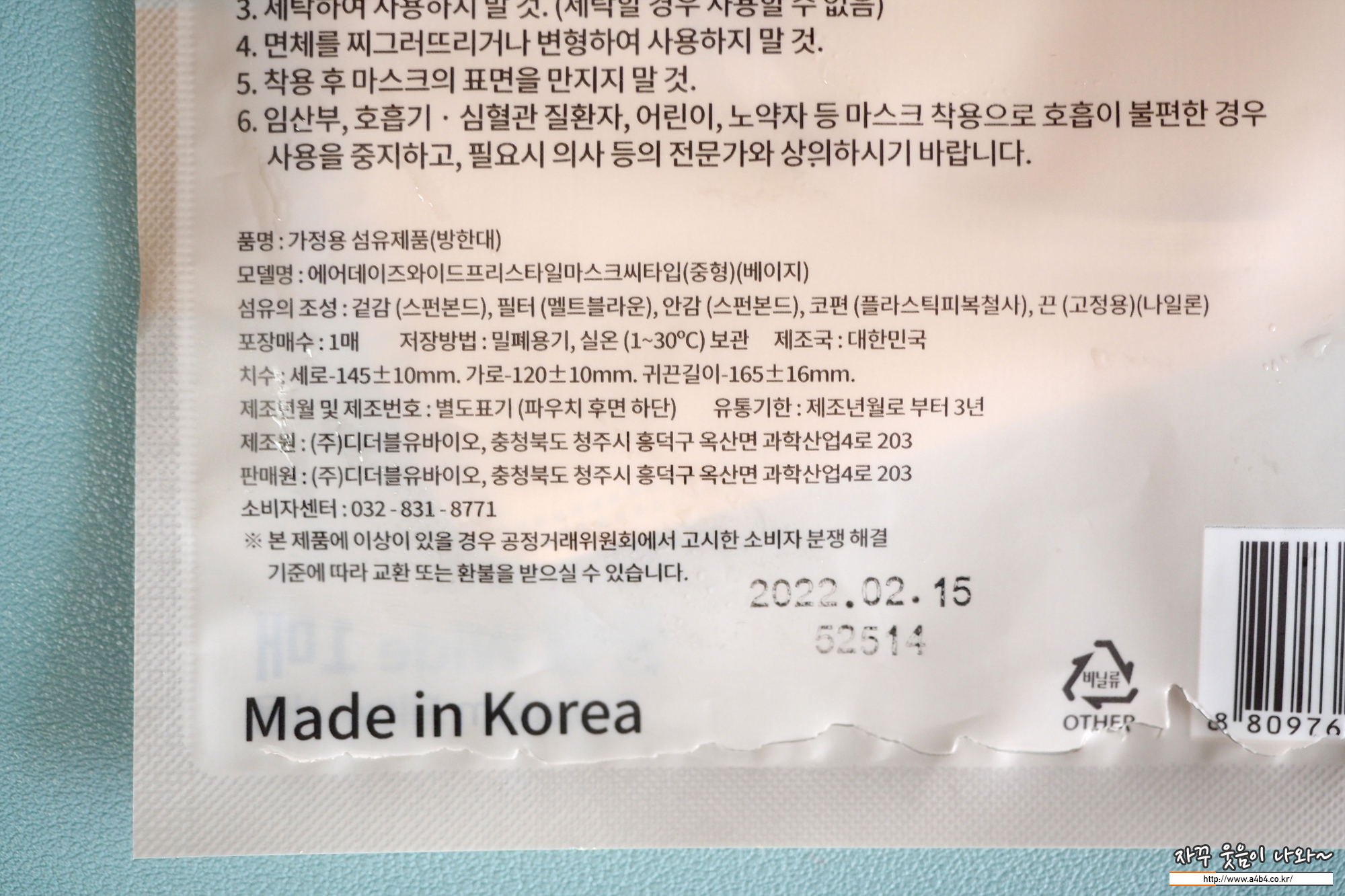 마스크 제조사는 기존 에어데이즈 보건용마스크를 생산 유통하는 디더블유바이오로 동일합니다.