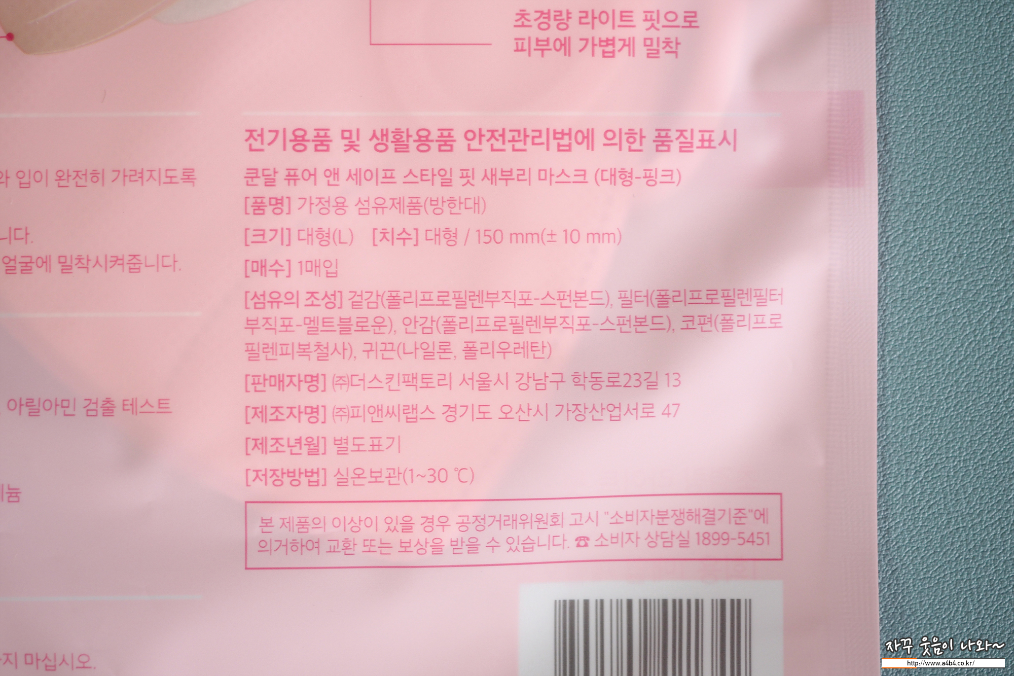 마스크에 사용된 귀걸이끈도 핑크 색상에 맞는 컬러로 잘 매치되어 있습니다. 가끔씩 컬러마스크에 검정색 귀걸이끈 조합은 정말로...