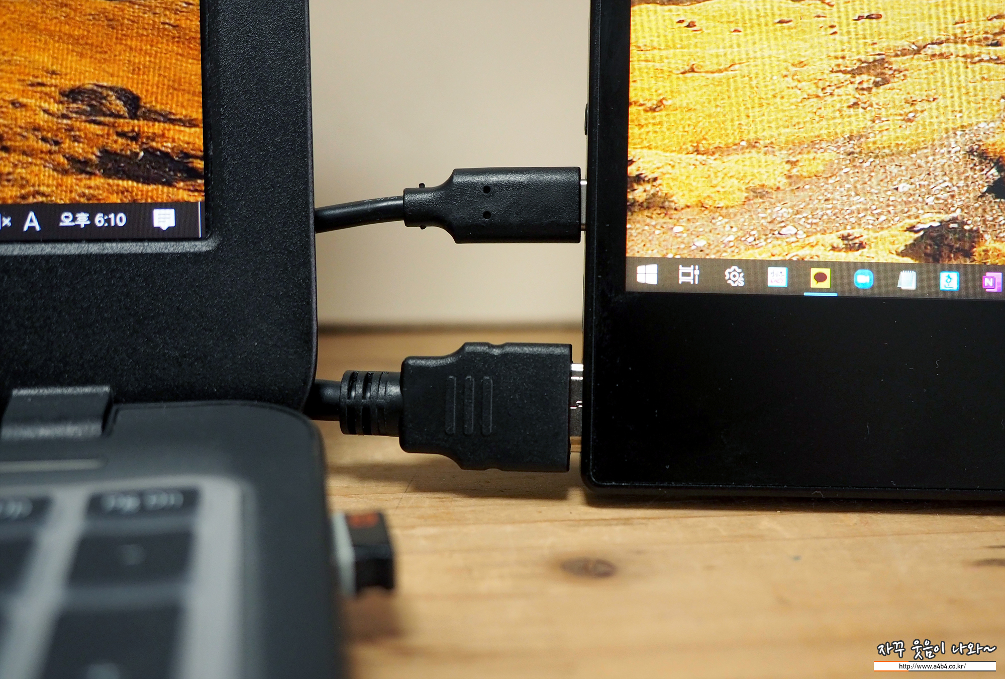 노트북의 경우 저는 구형 노트북이어서 HDMI를 통해 연결이 필요합니다. 그래서 포터블 모니터 구동 위한 별도 아답터 연결이 필요한데요. 노트북이 USB-C를 지원한다면, 별도 아답터 없이 노트북 전원을 이용해 사용이 가능합니다.