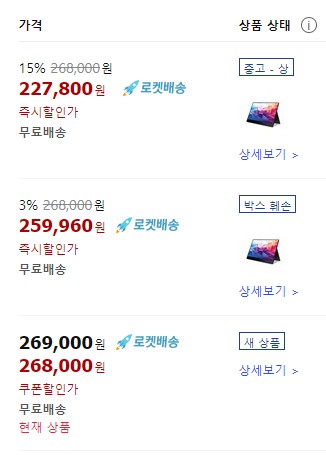 현재 가격은 268,000원이지만 리퍼를 잘 알아보면 20만원 초반에도 구입이 가능합니다.