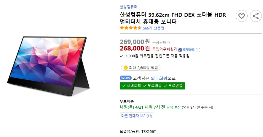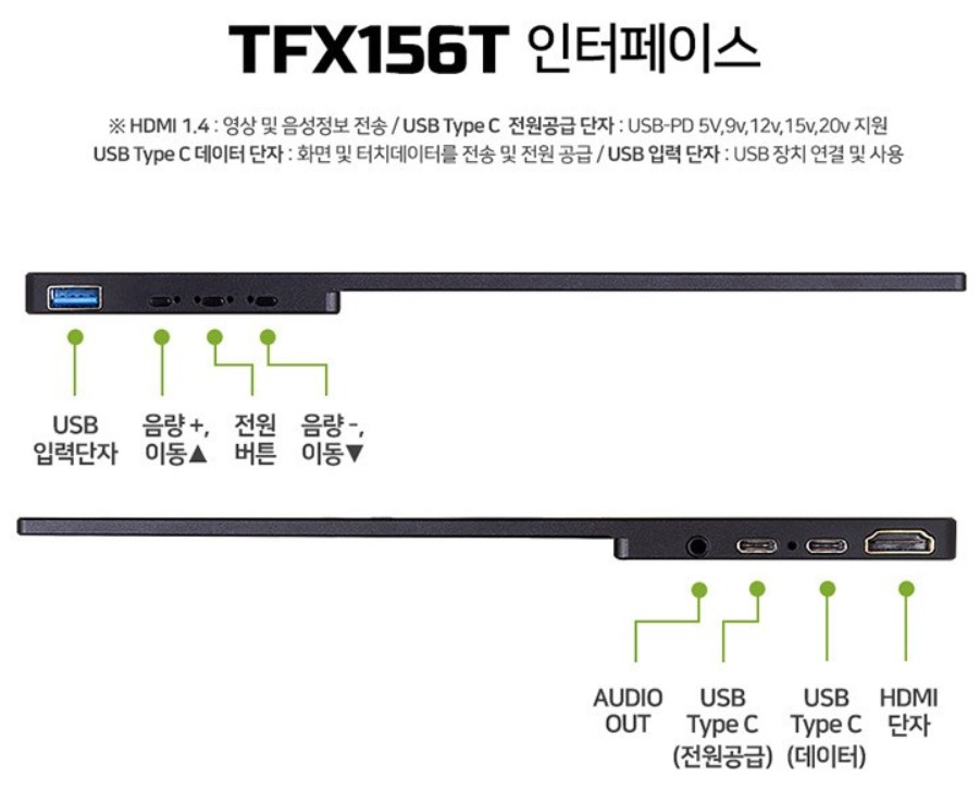 모델명 TFX156T '한성컴퓨터 39.62cm FHD DEX 포터블 HDR 멀티터치 휴대용 모니터'는...