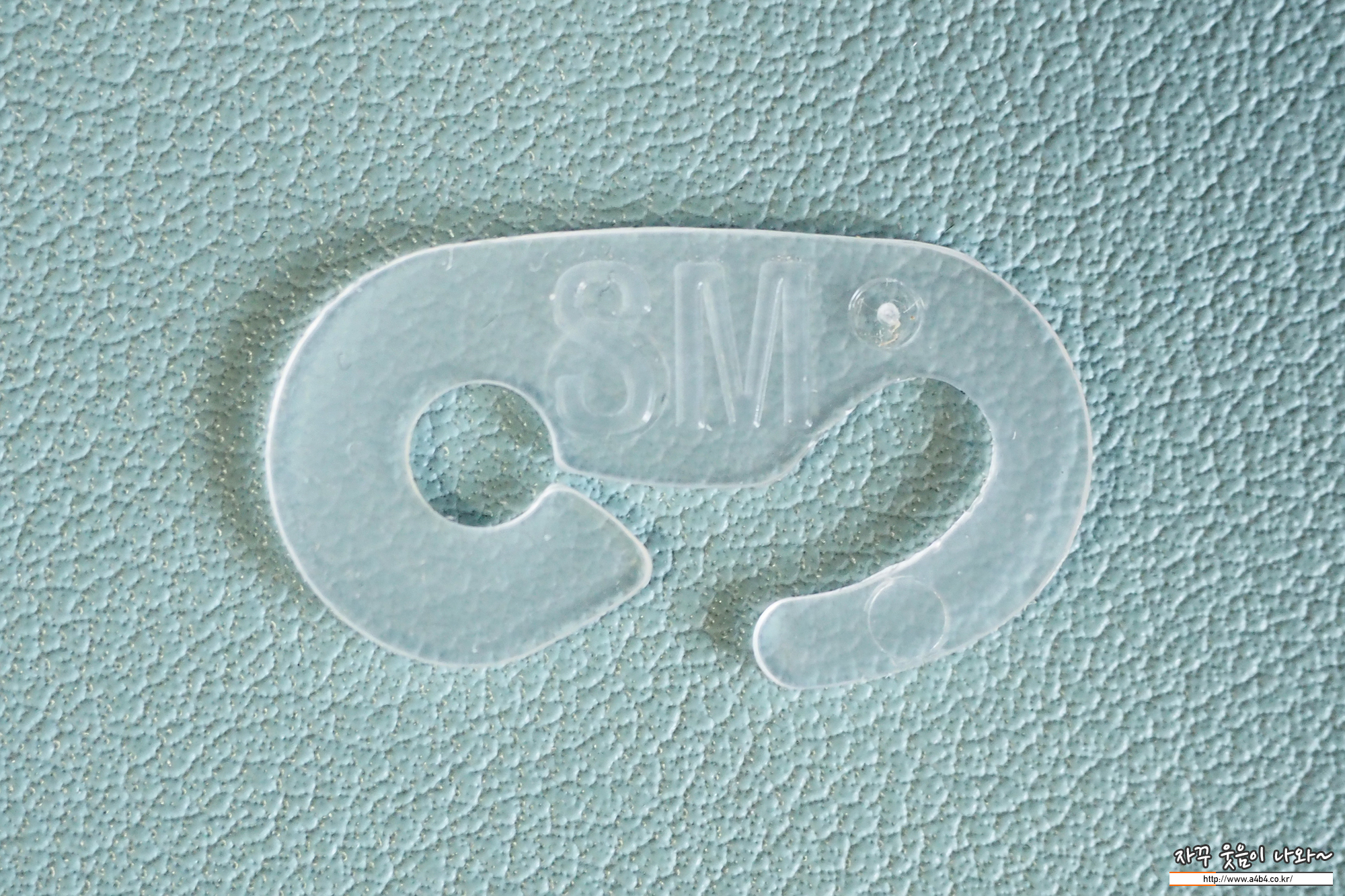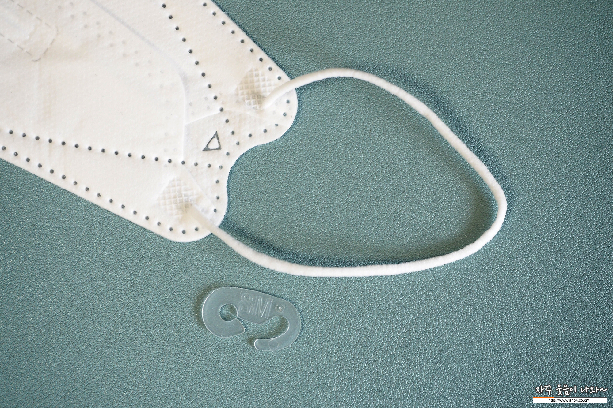 원형의 귀걸이끈이 마스크 뒷면에 접착되어 있으며, 투명 플라스틱 S자 후크가 포함된 마스크입니다. 귀걸이끈 접착 상태는 무난하며, 귀걸이끈 탄성은 보통수준을 보여줍니다.