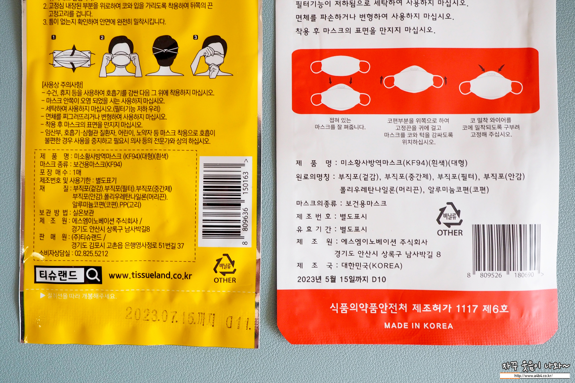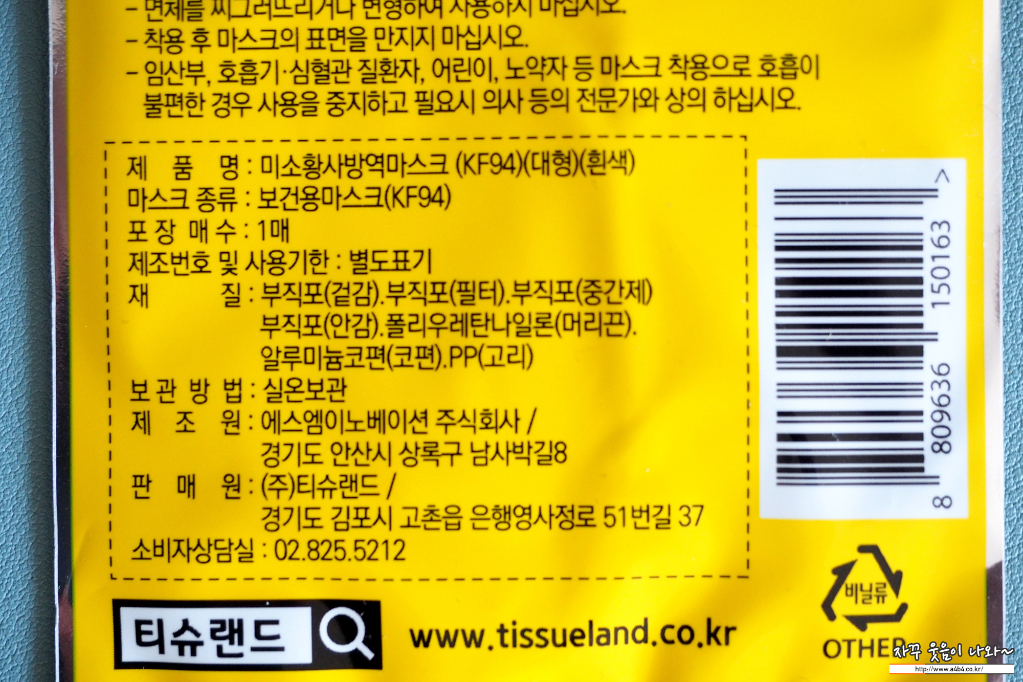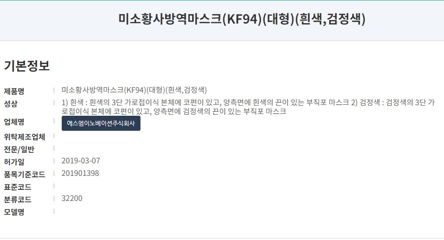 식품의약품안전처 의약품안전나라에 등록된 제품명칭은 '미소황사방역마스크 KF94' 입니다. 마스크에 관심 많으신 분들은 '미소'라는 이름만 들으셔도 정말로 다양한 브랜드가 생각나실 듯 합니다. 19년 3월 승인된 마스크로 제조원인 '에스엠이노베이션주식회사' 판매원은 주식회사 티슈랜드입니다. 식약처에 불량마스크로 등록된 이력은 없습니다.
