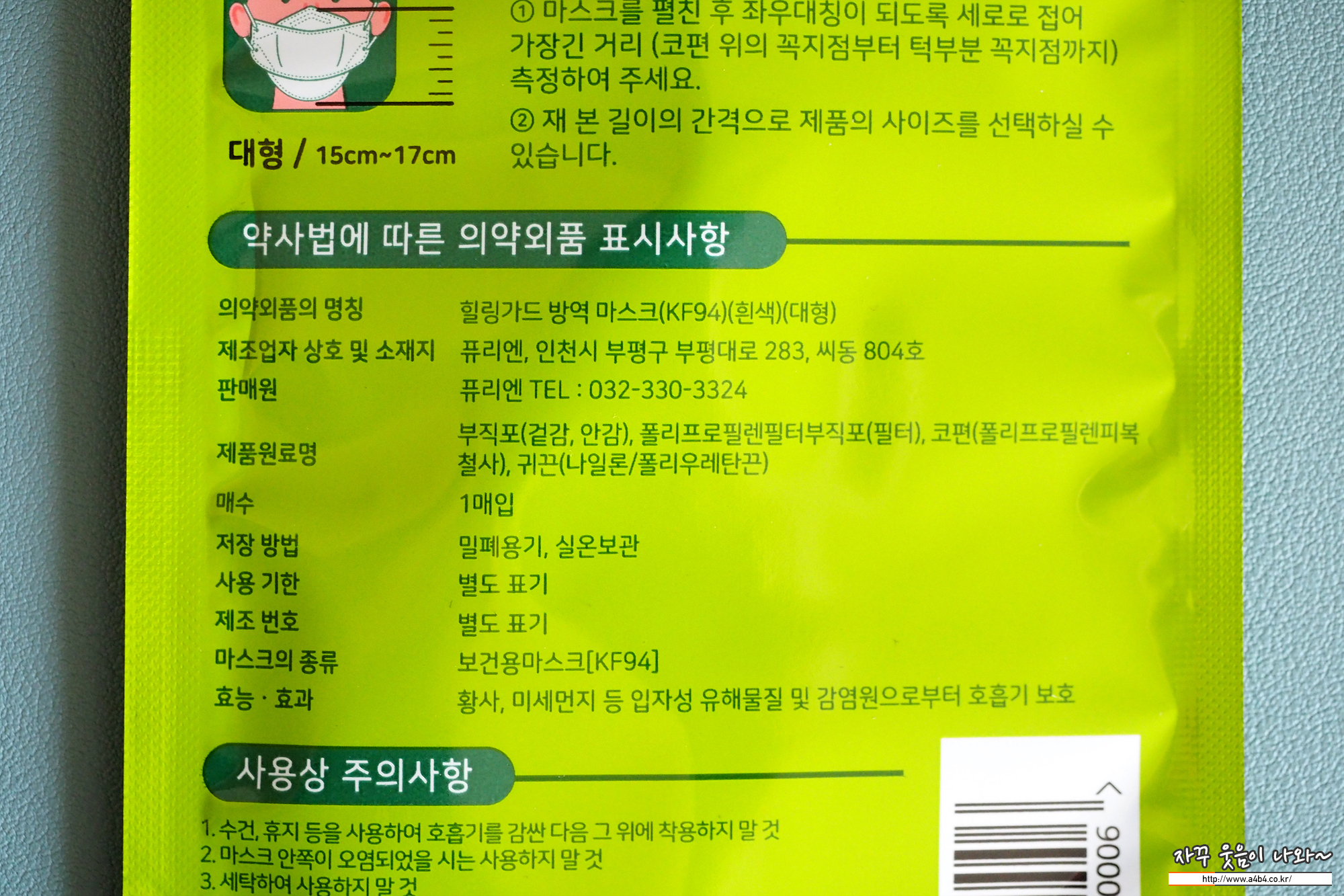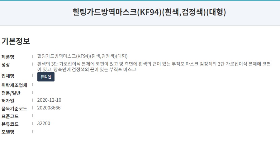 식약처에 등록된 제품명핑은 '힐링가드 방역마스크 KF94'입니다. 20년 12월 식약처 등록된 보건용마스크로 마스크 제조원은 '퓨리엔'입니다. '퓨리엔'과 '힐링가드' 브랜드로 몇몇 제품을 생상, 판매하고 있는 제조사입니다.