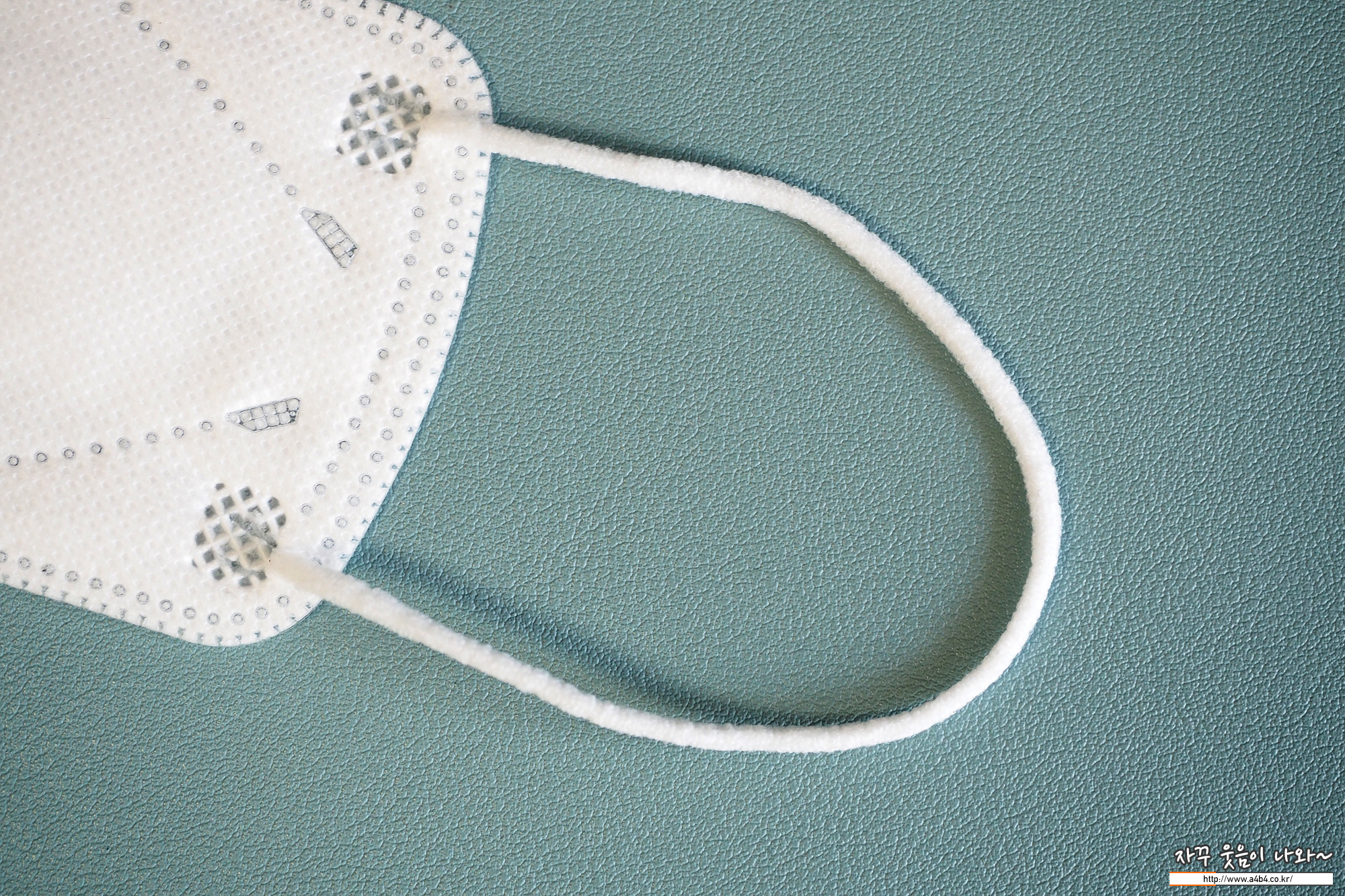 둥근 모양의 끈이 마스크 앞부분에 접착된 퓨리엔 힐링가드 마스크 이어밴드 탄력은 조금 짱짱한 타입입니다.
