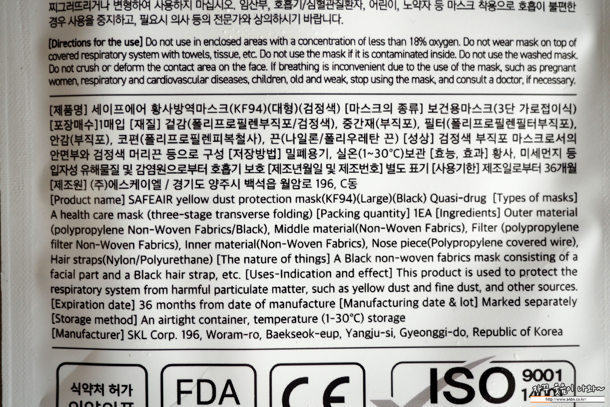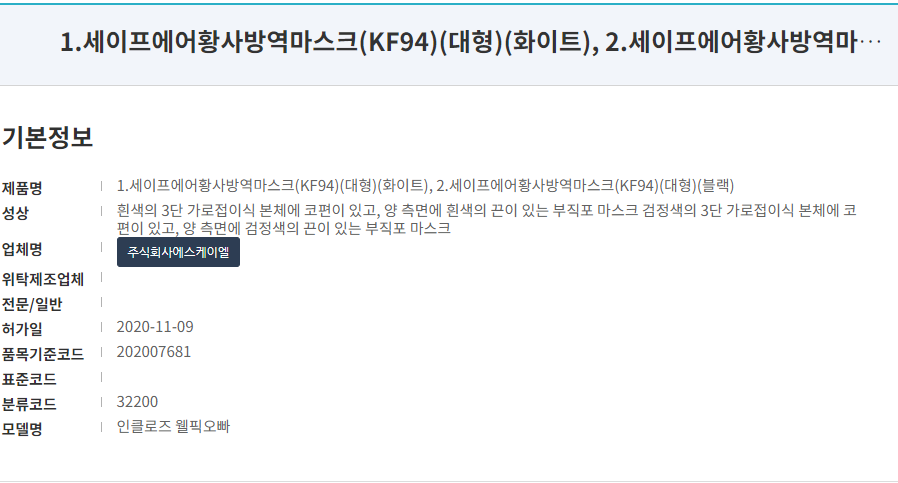 식품의약품안전처에 등록된 제품명은 '세이프에어황사방역마스크(KF94)'입니다. 크기는 대형, 색상은 흰색과 검정색이 출시되어 있습니다. 20년 10월 승인된 제품으로 마스크 제조원은 '주식회사에스케이엘'입니다.