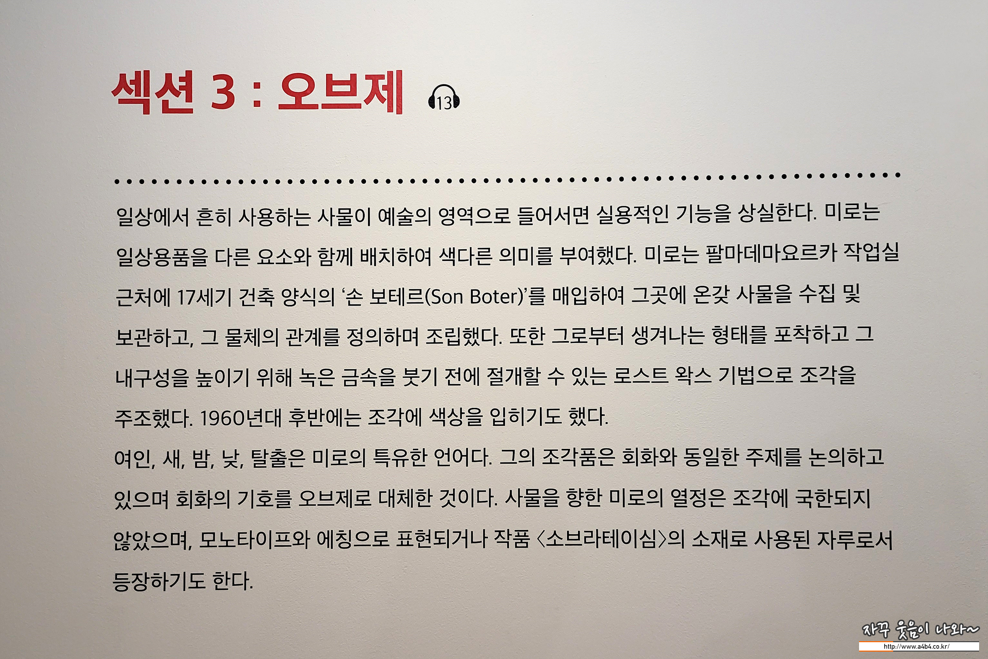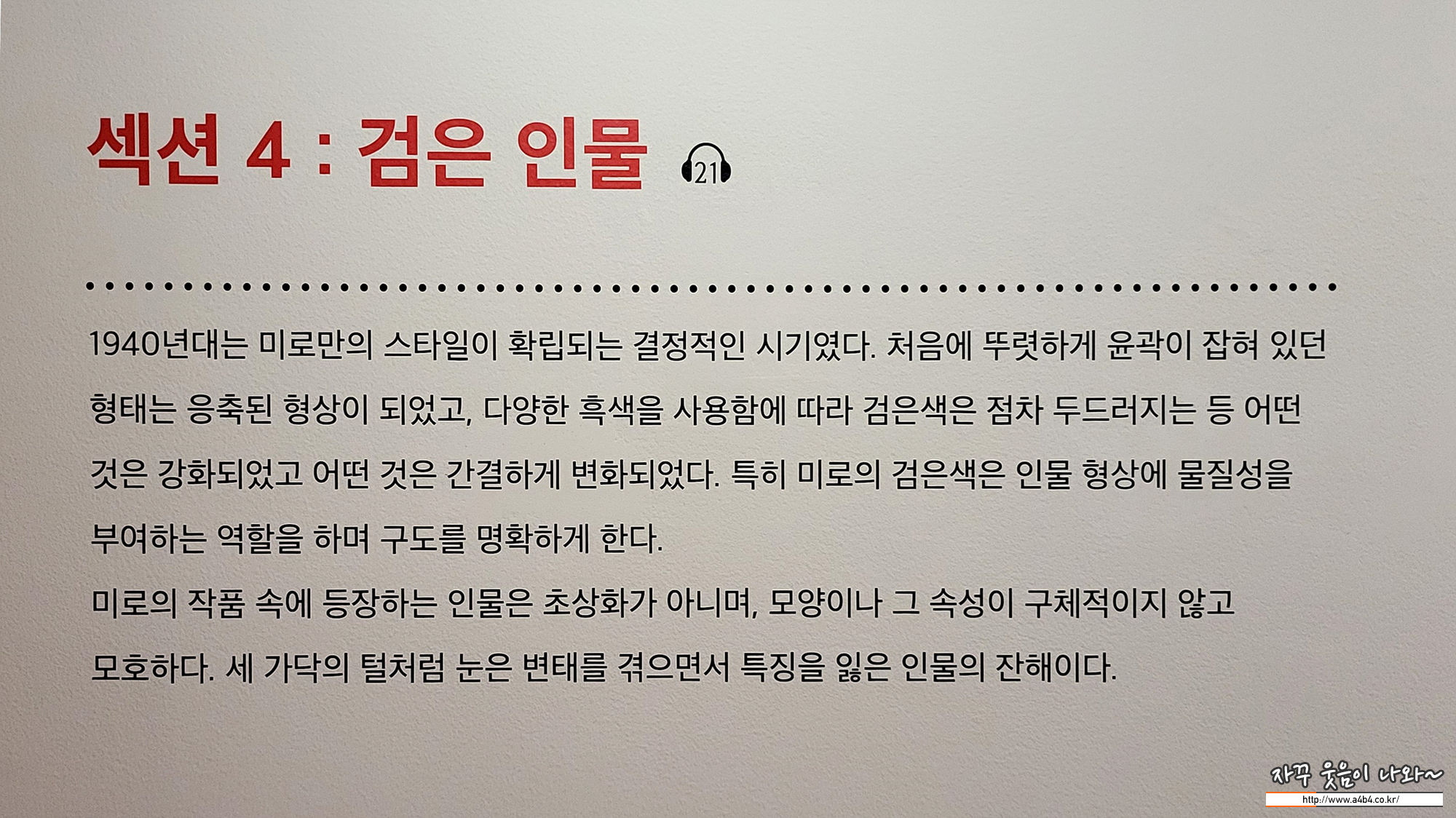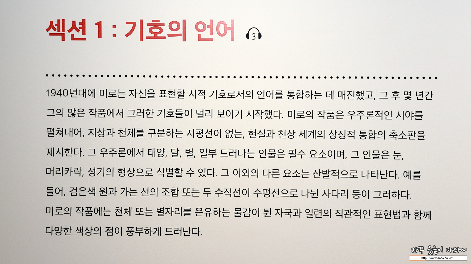 이번 호안미로 전시회는 총 4개 섹션으로 구성되어 있으며, 1시간 30분 전후 관람시간이 필요합니다. 물론 관람시간은 개인차가 상당히 크기는 하지만...