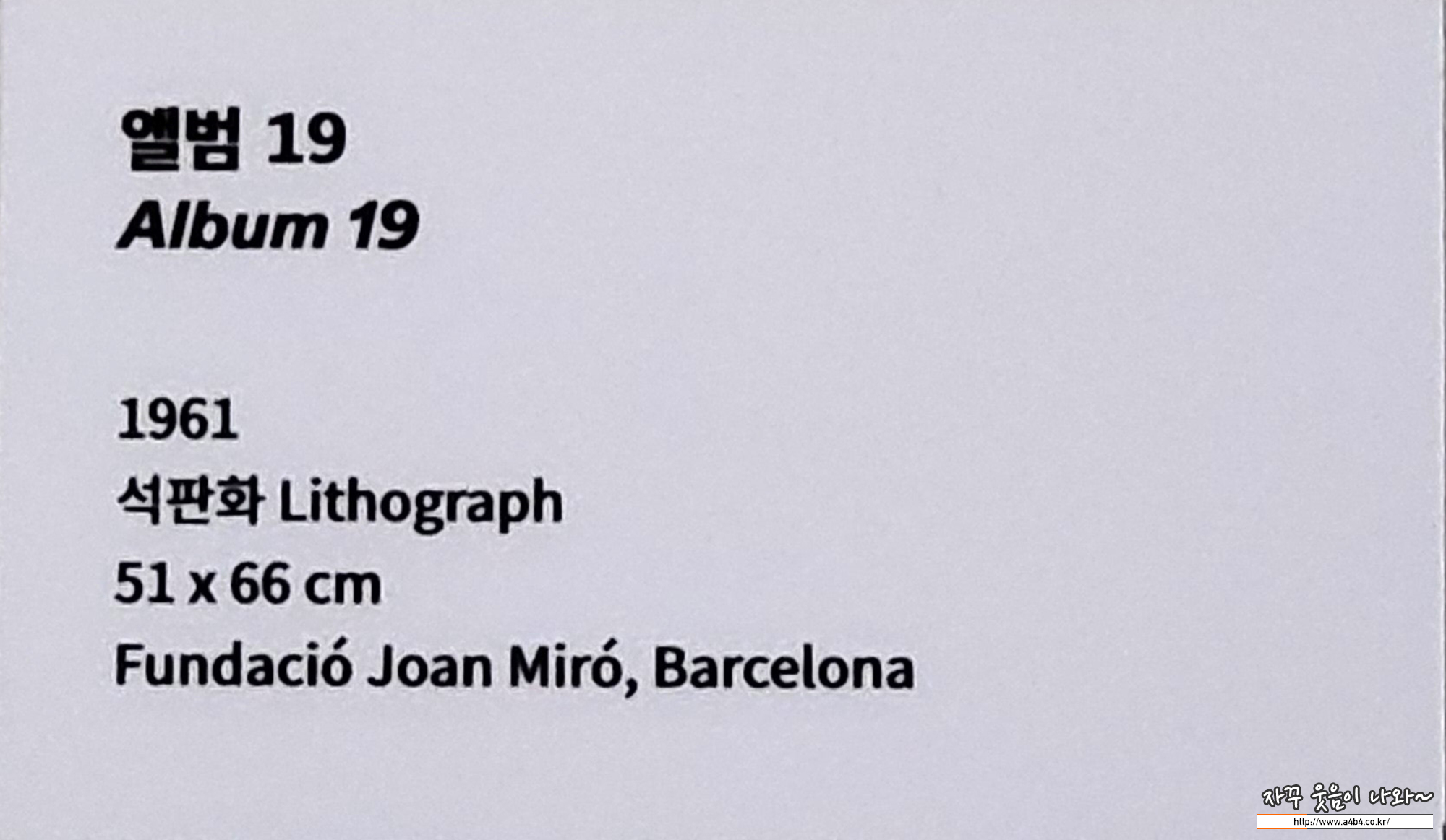 1961년에 제작된 앨범 19'는 호안 미로가 프랑스 초현실주의 소설가이자 시인인 레몽 크노와 협업해 제작한 책입니다. 글 작가와 화가의 특별한 만남으로 만들어진 앨범 19'에는 미로의 그림과 크노의 짧은 글이 수록되어 있습니다. 앨범 19’라는 제목답게 미로의 오리지널 석판화 19점이 담겨있는데, 이번 전시에서는 그중 두 점의 작품을 소개합니다. 앨범 19’작품들은 별도의 이름 없이 번호로 구분되고 있는데요, 이 작품들은 각각 2번, 3번입니다. 제목이 없는 추상화는 관람객이 참 다가가기 어렵게 느껴지기도 합니다.