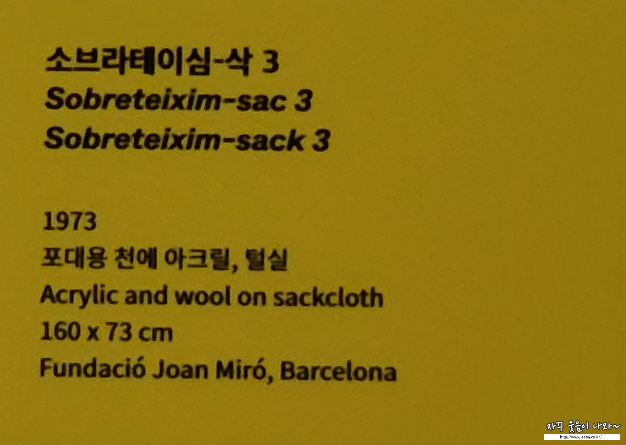 포대자루는 거칠고 굵은 실로 엉성하게 엮여 만들어져있고, 원래 어떤 용도로 사용되었는지 알 수 있게끔 브랜드 이름이나 생산지 등 정보가 프린트되어있기도 합니다. 미로는 포대자루를 이용한 직물 작품을 소브라테이심과 구분하기 위해 가방이라는 뜻을 가진 프랑스어 ‘삭’을 붙여 ‘소브라테이심 삭’이라고 불렀습니다. 포대자루라는 재료는 원래 용도에 따라 경제적, 사회적 현실과 함께 구체적인 역사를 담고 있다는 점에서 미로가 오랜 시간 탐구해왔던 주제인 일상적인 삶과 같은 맥락을 공유하고 있습니다.