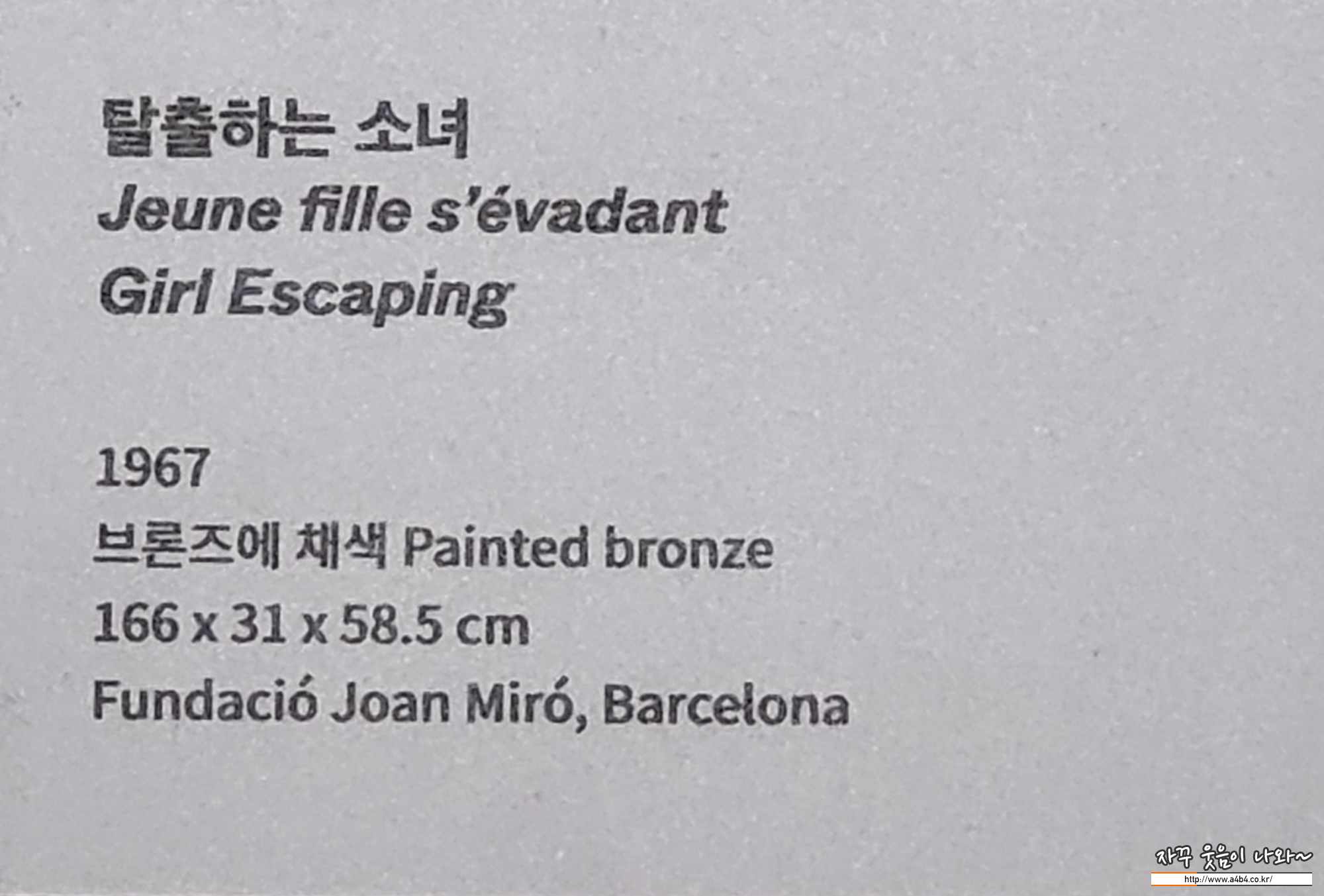 1920년대 후반과 1930년대 초반에 이르러 미로는 입체 구성을 탐구하기 시작했습니다. 초현실주의적인 영감을 바탕으로 미로는 산책길이나 일상에서 발견한 사물을 결합해 독특한 형태를 만들어 갔습니다. 거기에 점토로 만들어낸 모형을 덧붙이는 방식을 보여주기도 했는데, 마음에 드는 모습이 나오면 전통적인 청동 주물 방식을 이용해 브론즈 작품을 완성했습니다. 여러개의 사물을 모아 만든 조합은 청동이라는 재료를 통해 하나의 덩어리로 탄생했습니다. 미로는 브론즈의 표면을 다듬으며 촉각적인 부분도 신경을 썼는데요. 기본 브론즈 작품들과 다르게 앞에 보고 계신 ‘탈출하는 소녀’에는 색이 칠해져 있습니다. 브론즈 조각이 청동이라는 재료로 표면 질감이 강조되었던 반면, 채색 브론즈 조각은 표면의 질감보다는 강렬한 색에 이끌리게 됩니다. 색은 청동으로 만들어진 하나의 덩어리를 해체시키며 작품 각각의 부위를 강조합니다.