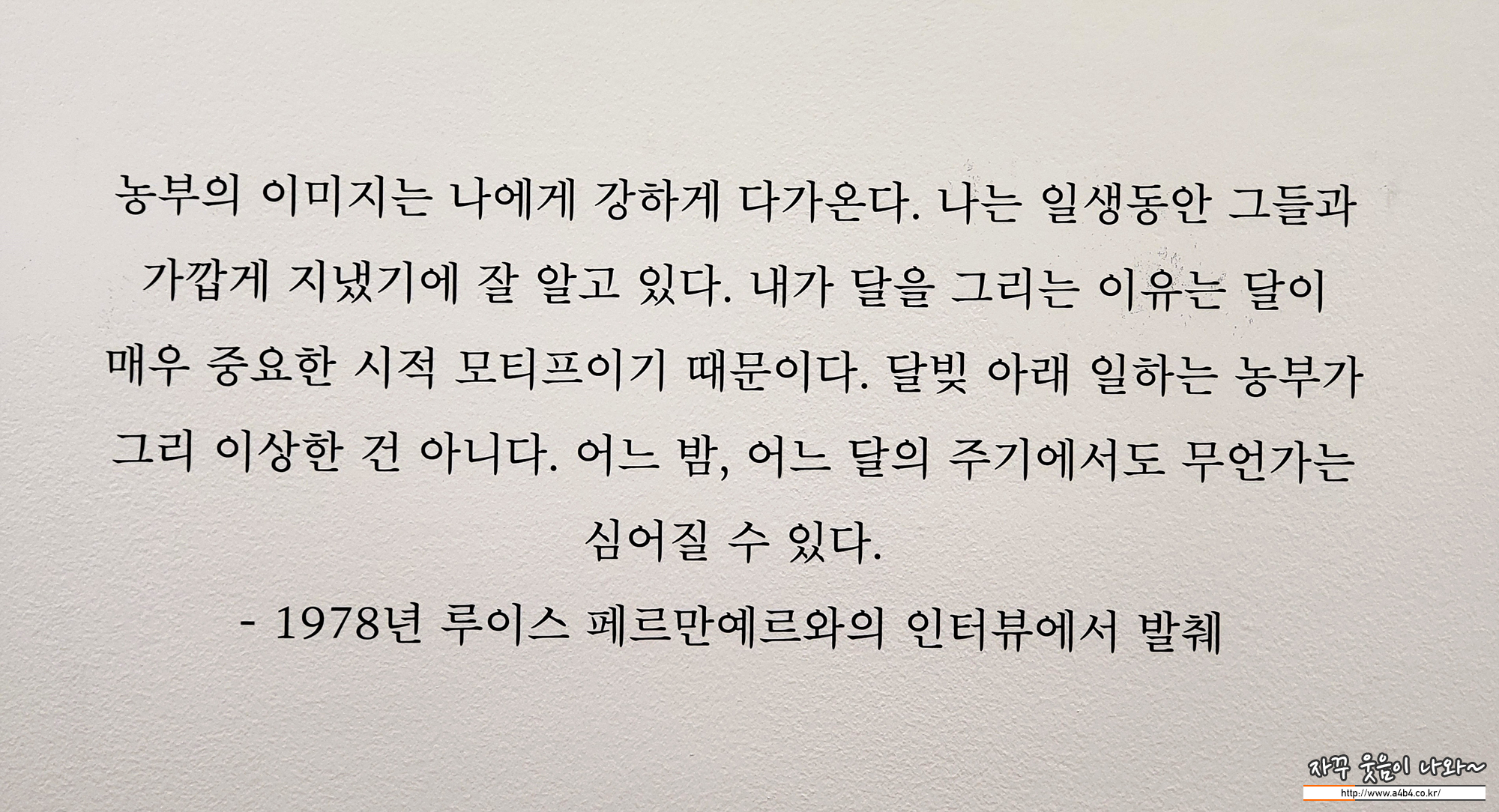 농부의 이미지는 나에게 강하게 다가온다. 나는 일생동안 그들과 가깝게 지냈기에 잘 알고 있다. 내가 달을 그리는 이유는 달이 매우 중요한 시적 모티프이기 때문이다. 달빛 아래 일하는 농부가 그리 이상한 건 아니다. 어느 밤, 어느 달의 주기에서도 무언가는 심어질 수 있다.