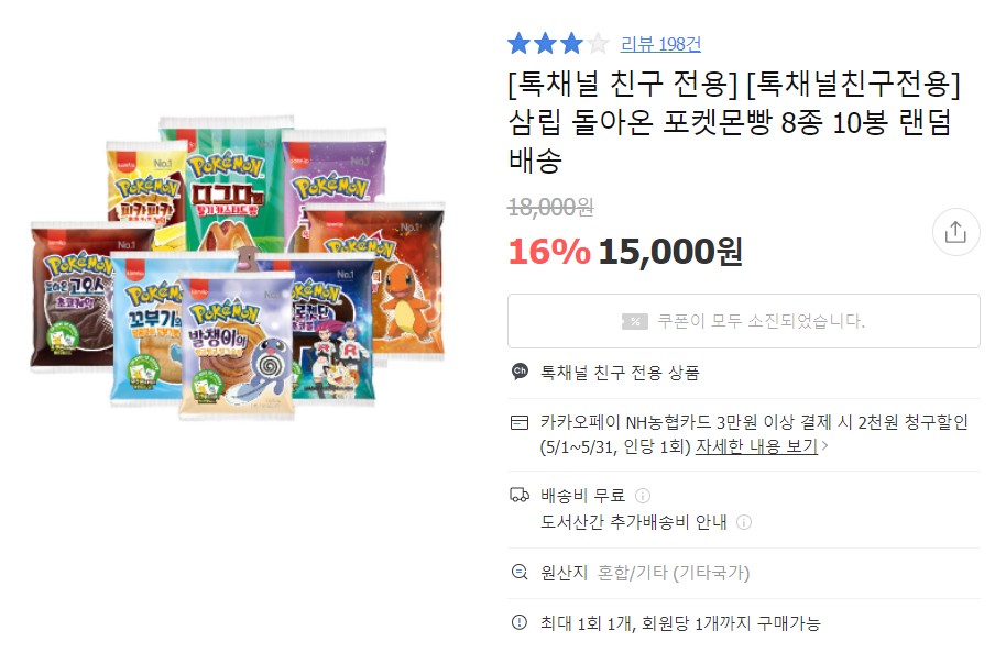 온라인에서는 포켓몬빵과 다른제품을 끼워 팔거나 높은 배송료를 받는 경우가 허다한데...