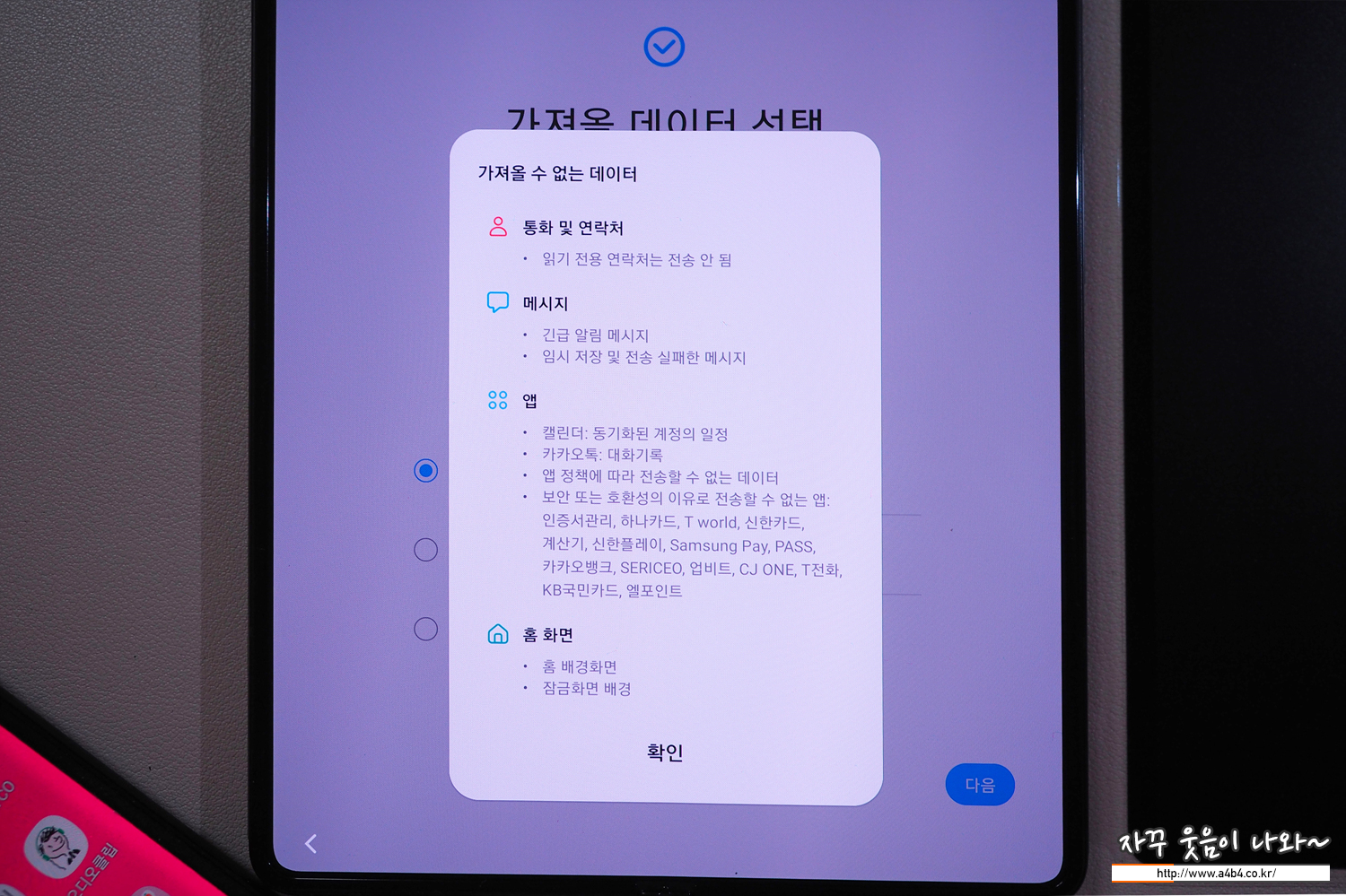 보안 등 여러 이유로 데이터 백업 및 복원이 안되는 앱이나 데이터가 있습니다. 아래 안내문을 참고하시명 되비만