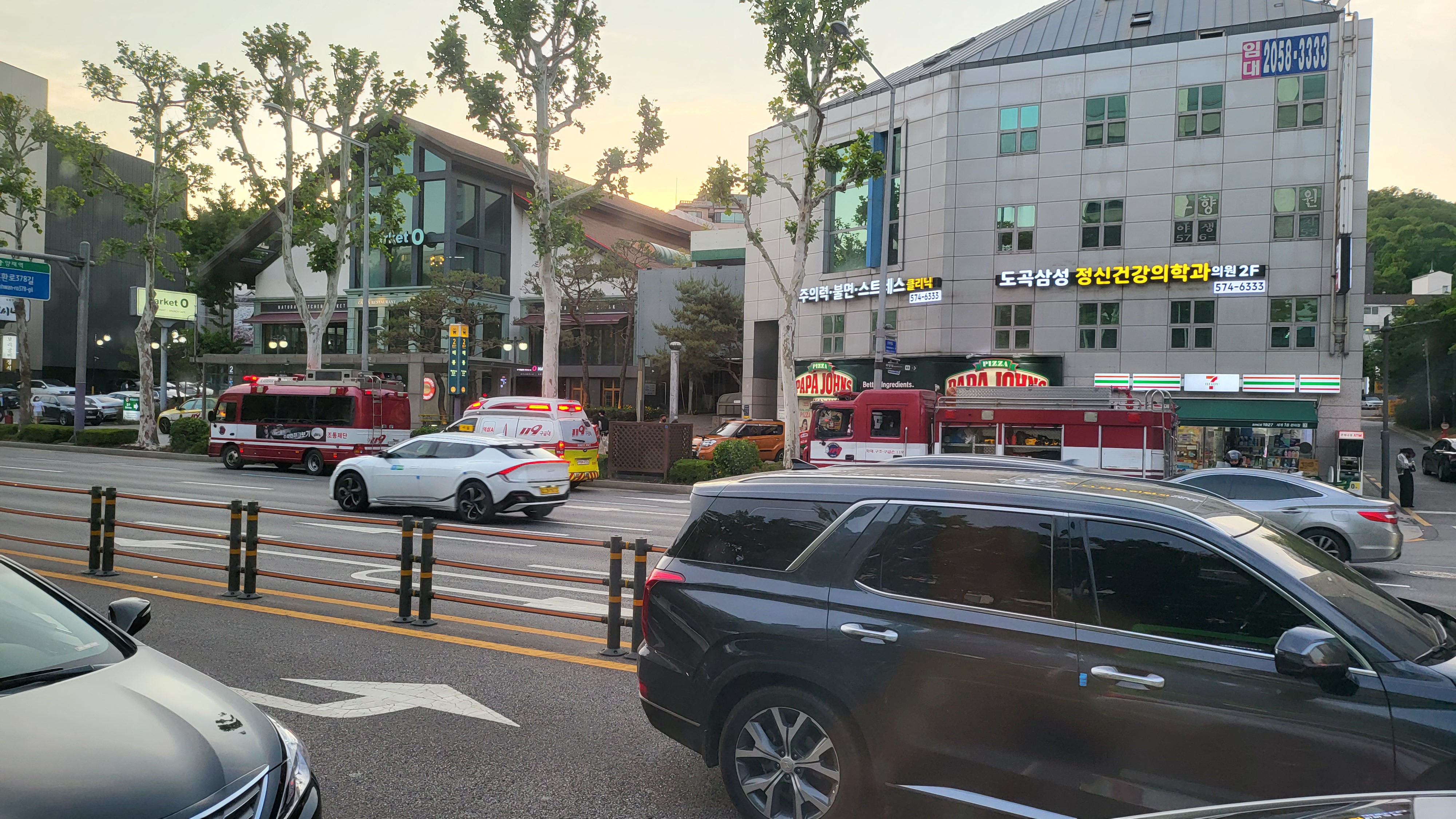 사진 밖에도 소방차와 경찰차 있고 입구 폐쇄중