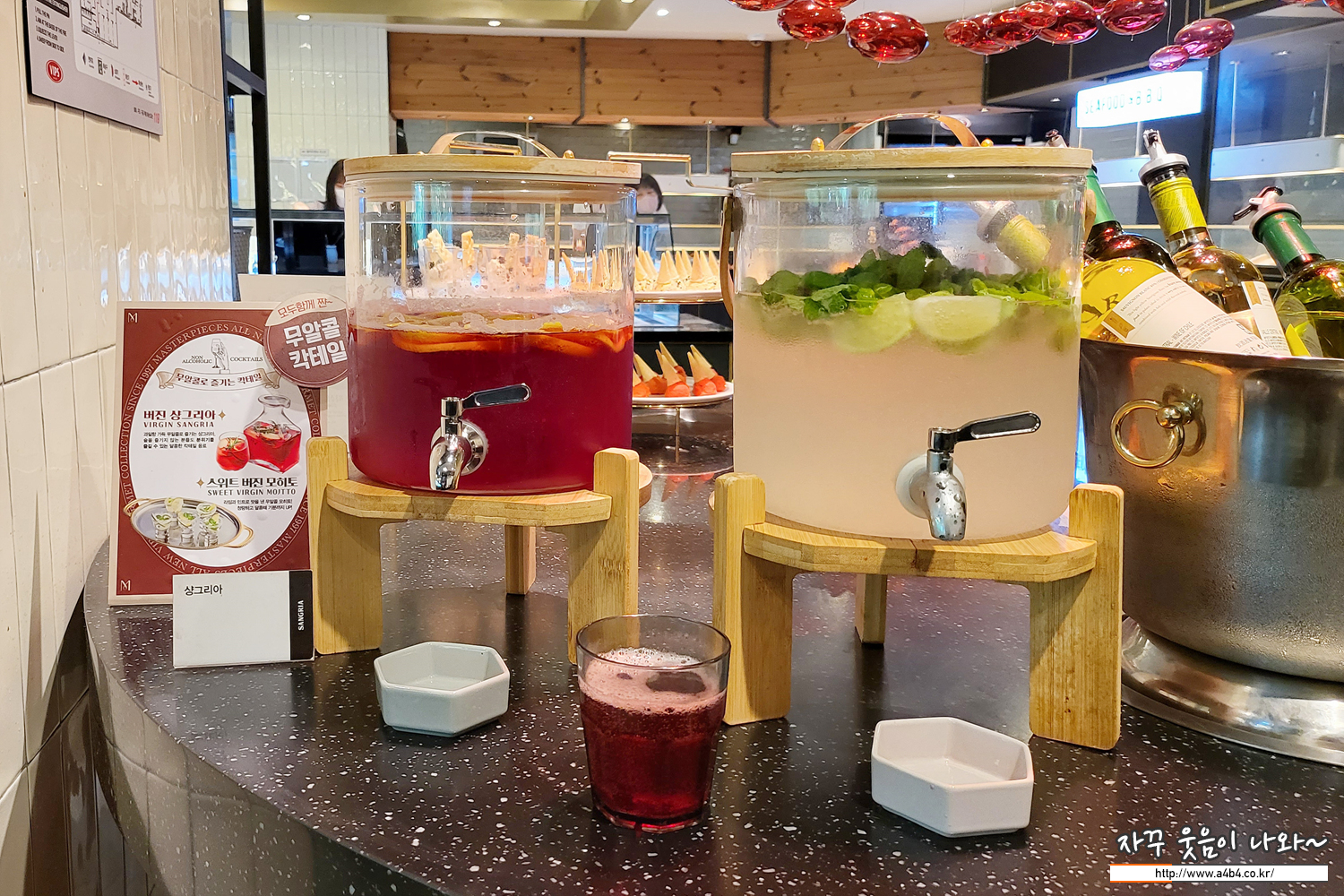 무알콜 샹그리아와 탄산음료, 커피, 간단한 티백음료 등이 준비되어 있습니다. 차를 가지고 갔으니 맥주나 와인이 어떤 조건으로 제공되는지 관심도 없었네요.