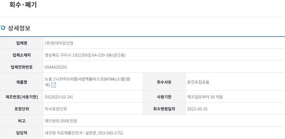모든 뉴포그니 브이쓰리 황사방역용마스크에 해당되는 것은 아닙니다. 식약처 안내와 같이 마스크 유효기간이 2025년 2월 24일 이면서 제조번호가 D5로 표시된 소형제품에 한합니다.