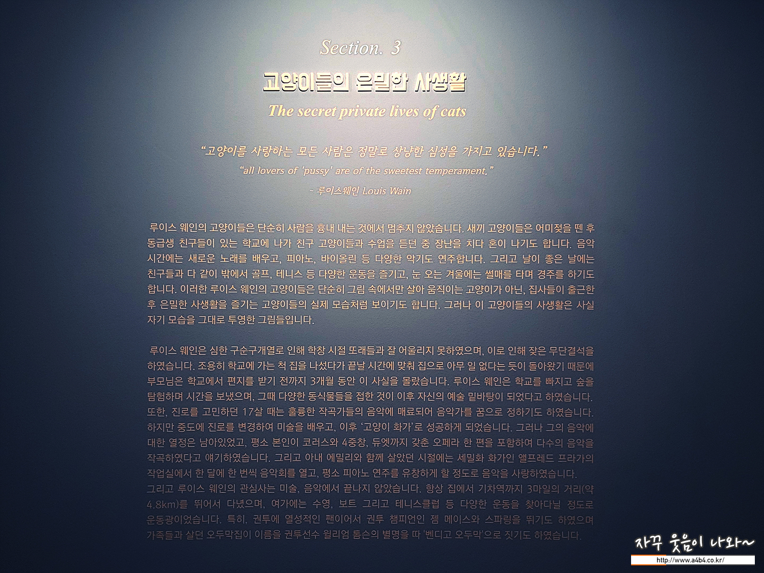 전시장 한 켠에는 루이스 웨인의 전기영상이 상영되고 있습니다. 만약 작가를 전혀 모르거나 영화를 보지 않으셨다면, 이 전기영상을 먼저 감상하시고 전시회장을 보시는 것도 좋아 보입니다.
