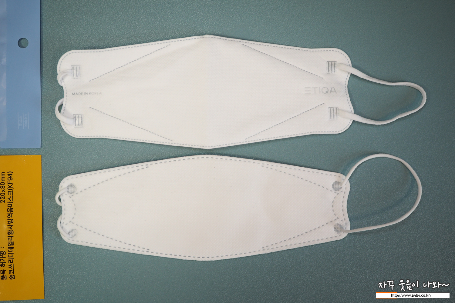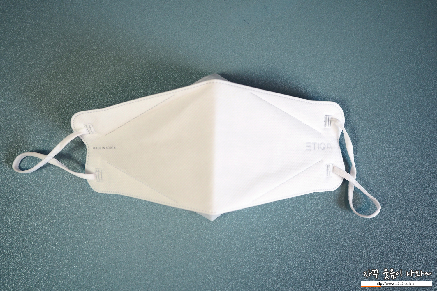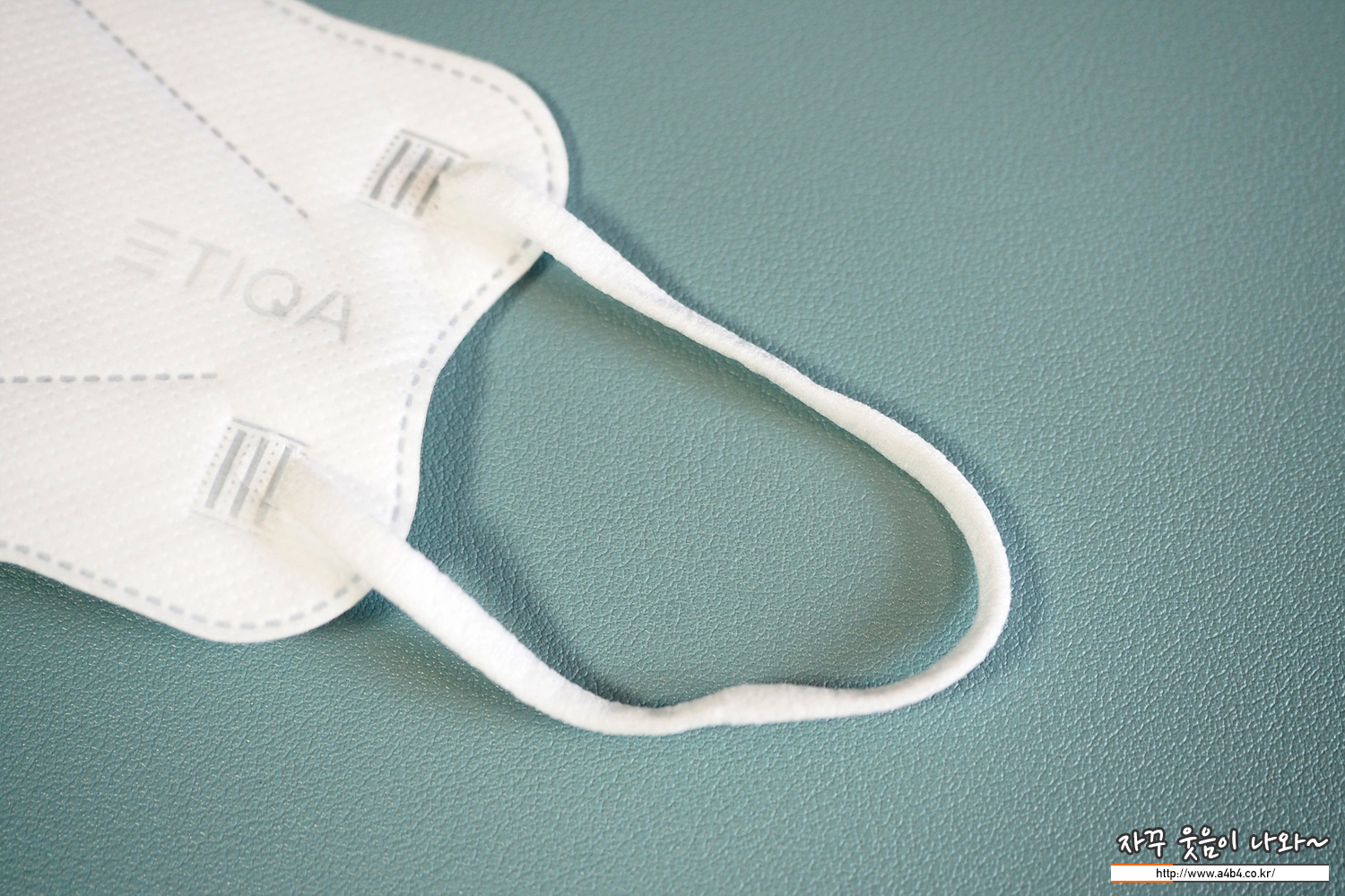 KF94 에티카 에어라이트 스탠다드 마스크는 고급형 마스크에 종종 사용되는 납작한 디자인의 이어밴드가 마스크 앞부분에 부착되어 있습니다. 에티카의 삼선 압인도 보이네요.