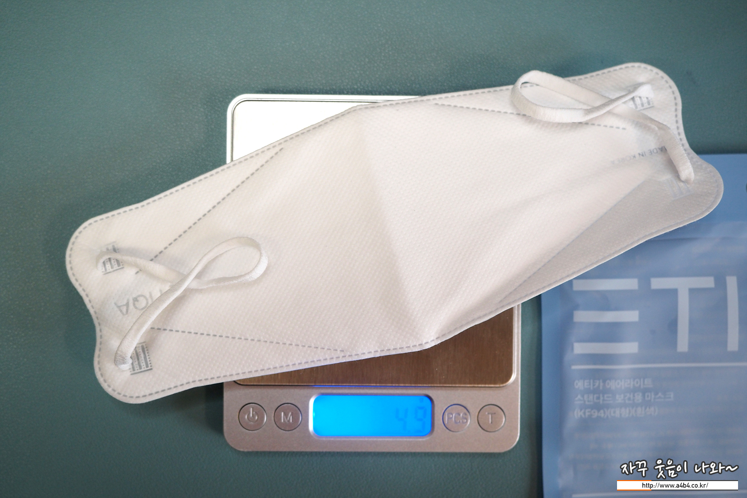 KF94 입체형 에티카 에어라이트 스탠다드 보건용마스크 중량은 4.9그램으로 타사제품과 비슷합니다.