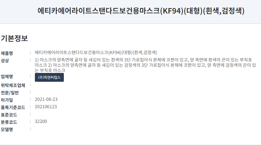 식품의약품안전처에 등록 제품명은 '에티카에어라이트스탠다드보건용마스크 KF94'입니다. 마스크 크기는 대형, 컬러는 블랙과 화이트, 그레이가 출시 되었씁니다.21년 8월 허가된 마스크로 마스크 제조원은 (주)피앤씨랩스, 유통은 주식회사 필트 입니다.