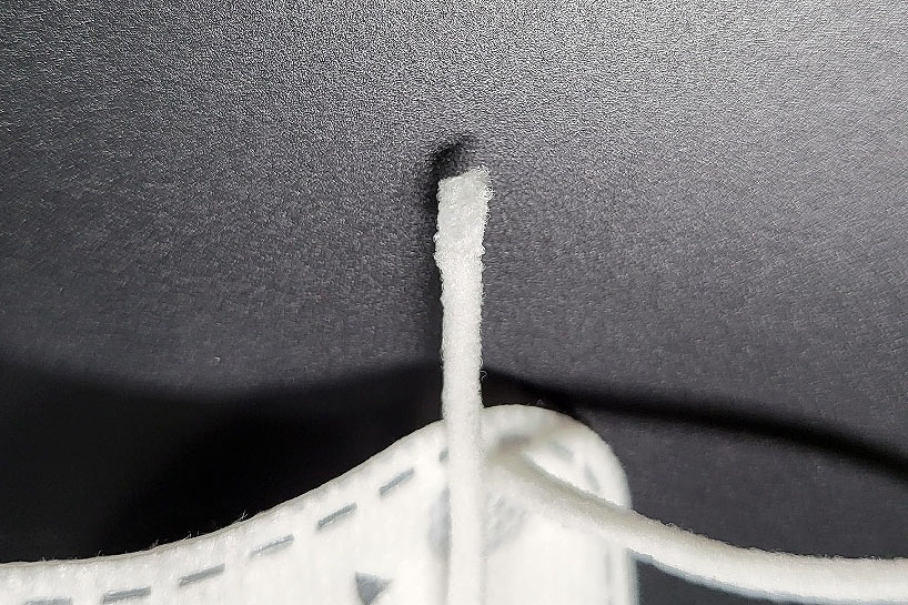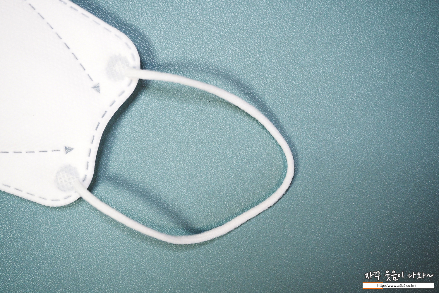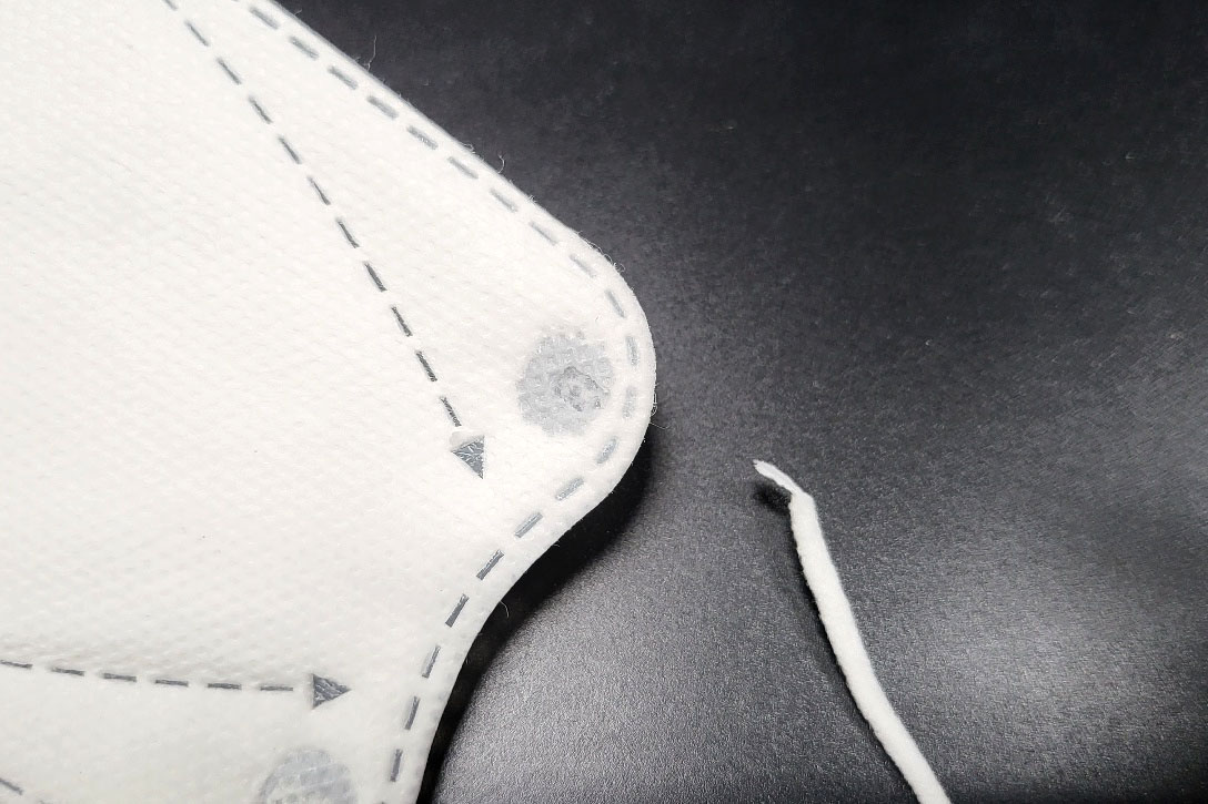 둥근모양의 귀걸이끈이 마스크 앞부분에 접착되어 있으며 키퍼니 마스크에 사용된 귀걸이끈 탄성은 보통 수준을 보여줍니다.