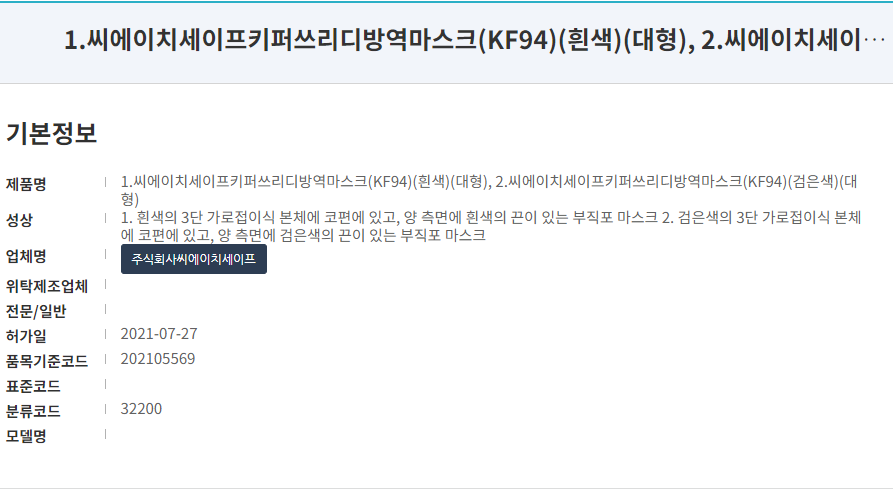 식약처 등록 제품명칭은 '씨에이치세이프키퍼쓰리디방역마스크 KF94'입니다. 대형사이즈로 흰색과 검정색이 있으며, 2D, 3D 타입이 출시되어 있습니다. 작년인 2021년 7월 승인된 마스크로 제조사는 '주식회사 씨에이치세이프'로 등록되어 있습니다. 해당 제품에 대한 식약처 불량마스크 기록은 없습니다.