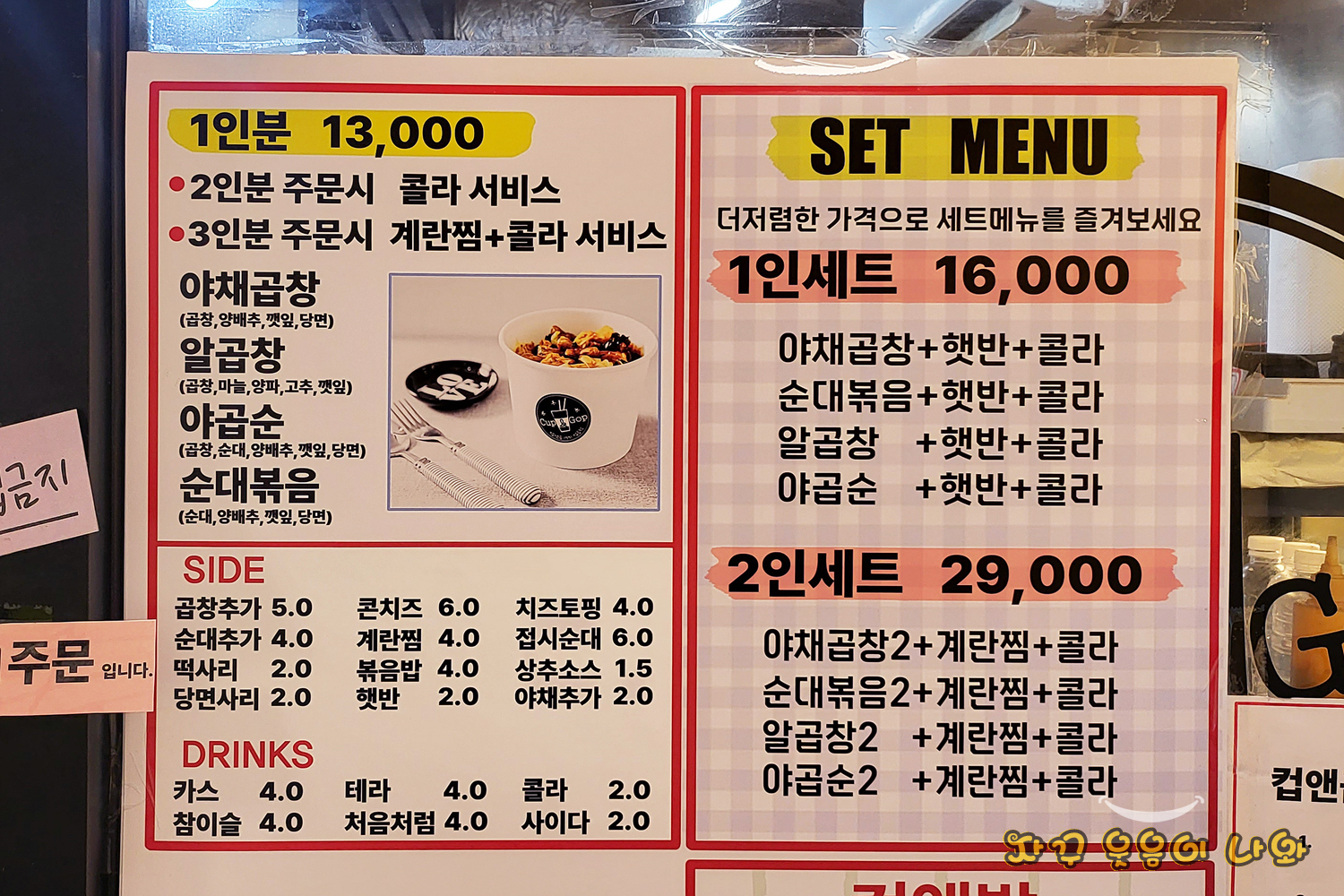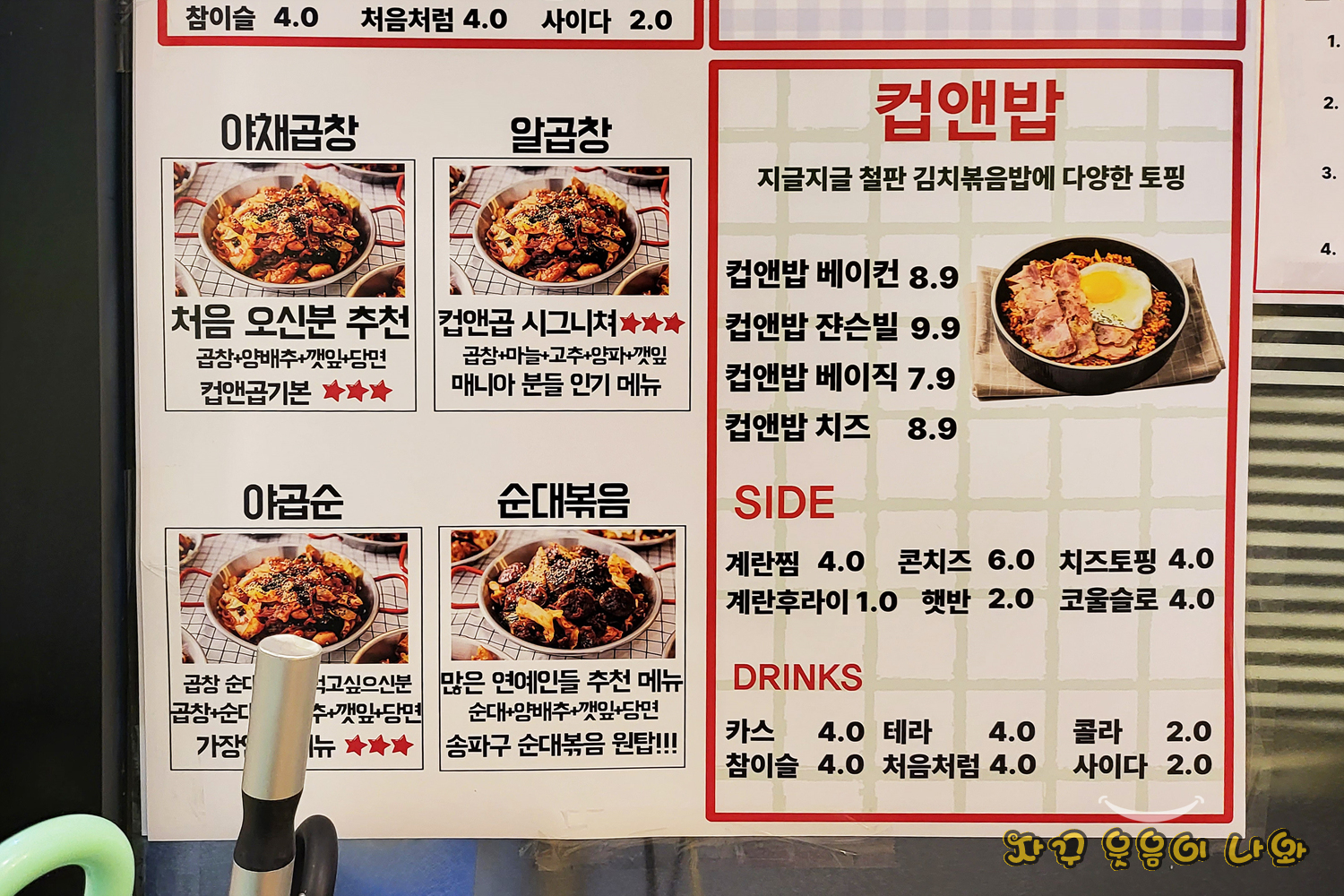 잠실새내 곱창맛집인 컵앤곱 매뉴 및 가격입니다. 야채곱창, 알곱창, 야곱순, 순대볶음이 메인이며, 추가로 밥매뉴가 있습니다. 이외에 사이드 메뉴들과 세트메뉴가 준비되어 있습니다. 가격은 곱창 1인분에 13,000원 입니다.