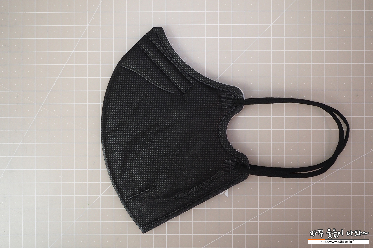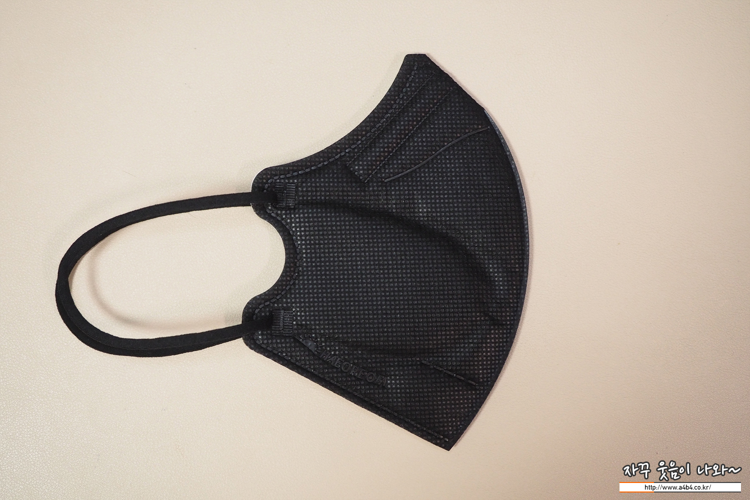 마스크 겉면은 패턴처리된 부직포가 사용되었습니다. 유광블랙 타입으로 조명상태에 따른 발색의 변화가 좀 있는 제품입니다. 전반적으로 마스크 염색 상태는 깔끔하게 잘 처리되어 있습니다.