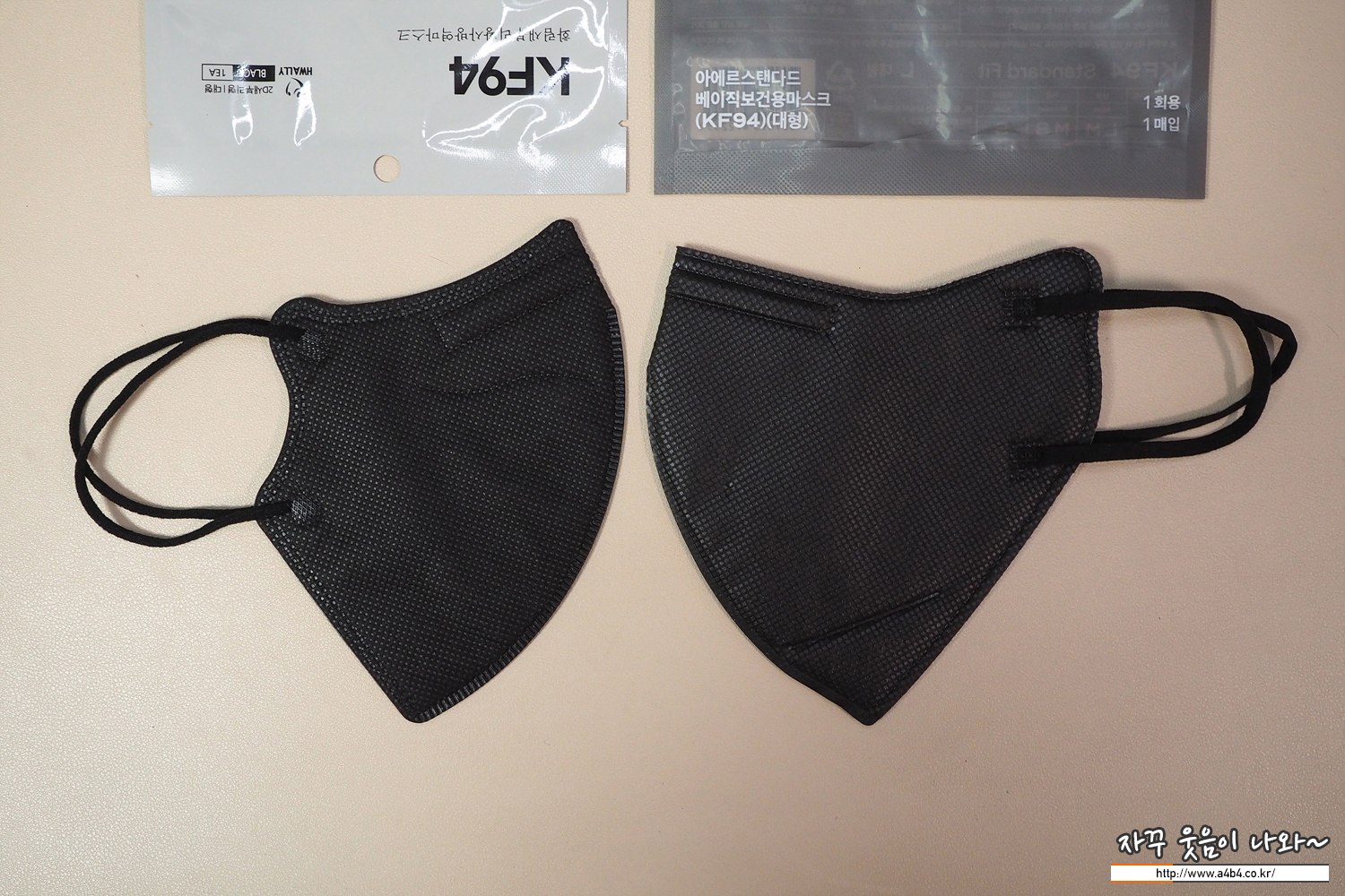 레이온 부직포 사용으로 소프트하지만 가장 깊은 블랙을 보이는 리앤웰 마스크 대형과 색상 비교