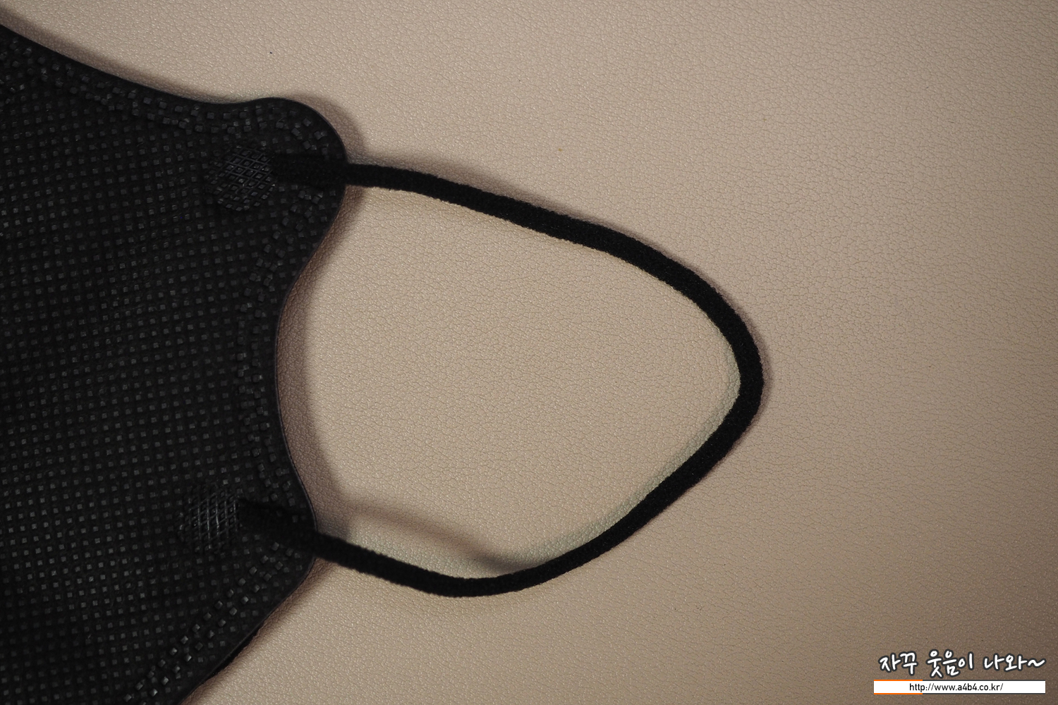 원형의 귀걸이끈이 마스크 앞부분에 부착되어 있으며, 부착 상태는 양호합니다. 또한 귀걸이끈 탄력 및 굵기는 일반적인 수준입니다. 고급 칼국수 귀걸이끈이 사용되지 않은 부분은 다소 아쉬운 부분입니다.