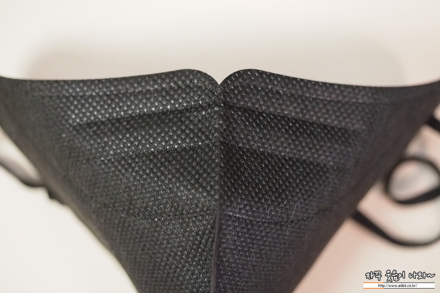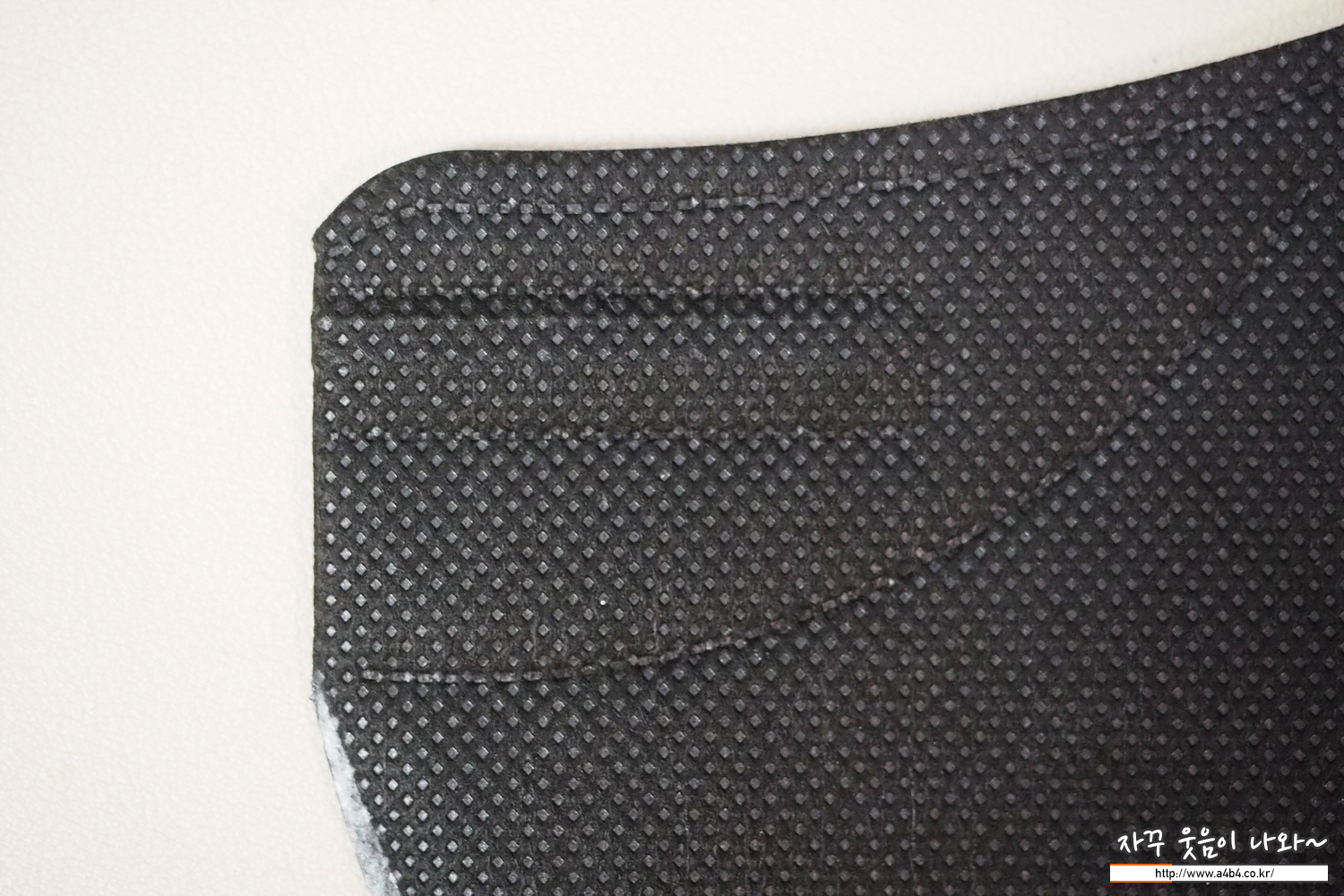쿤달 마스크 블랙 겉감은 패턴 처리된 검정색 부직포가 사용되었습니다. 염색 상태는 무난하며 빛 반사에 민감한 유광블랙 발색을 보여주고 있습니다.