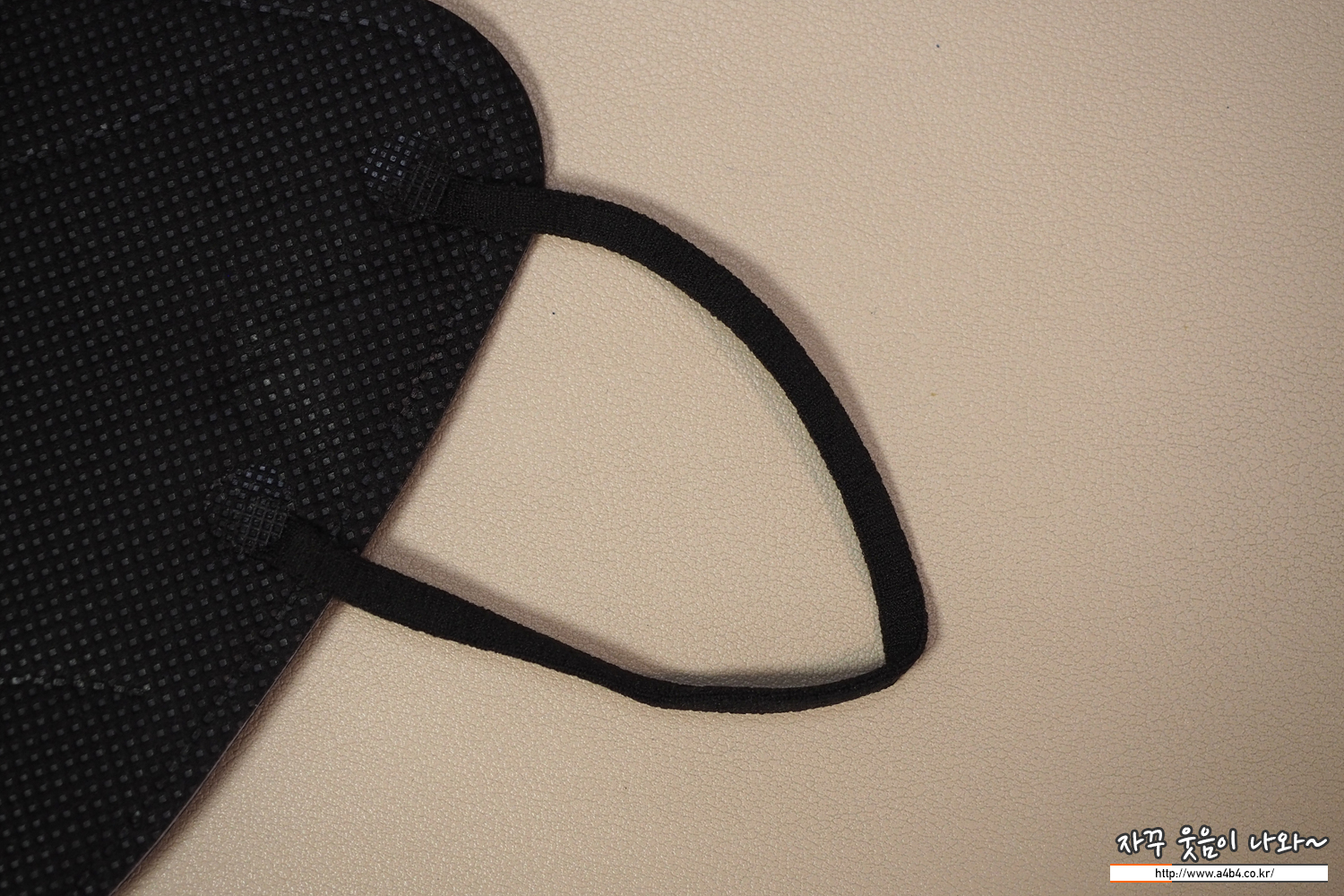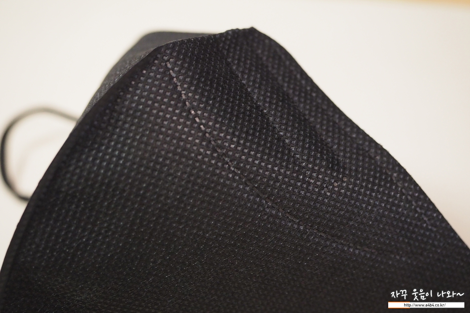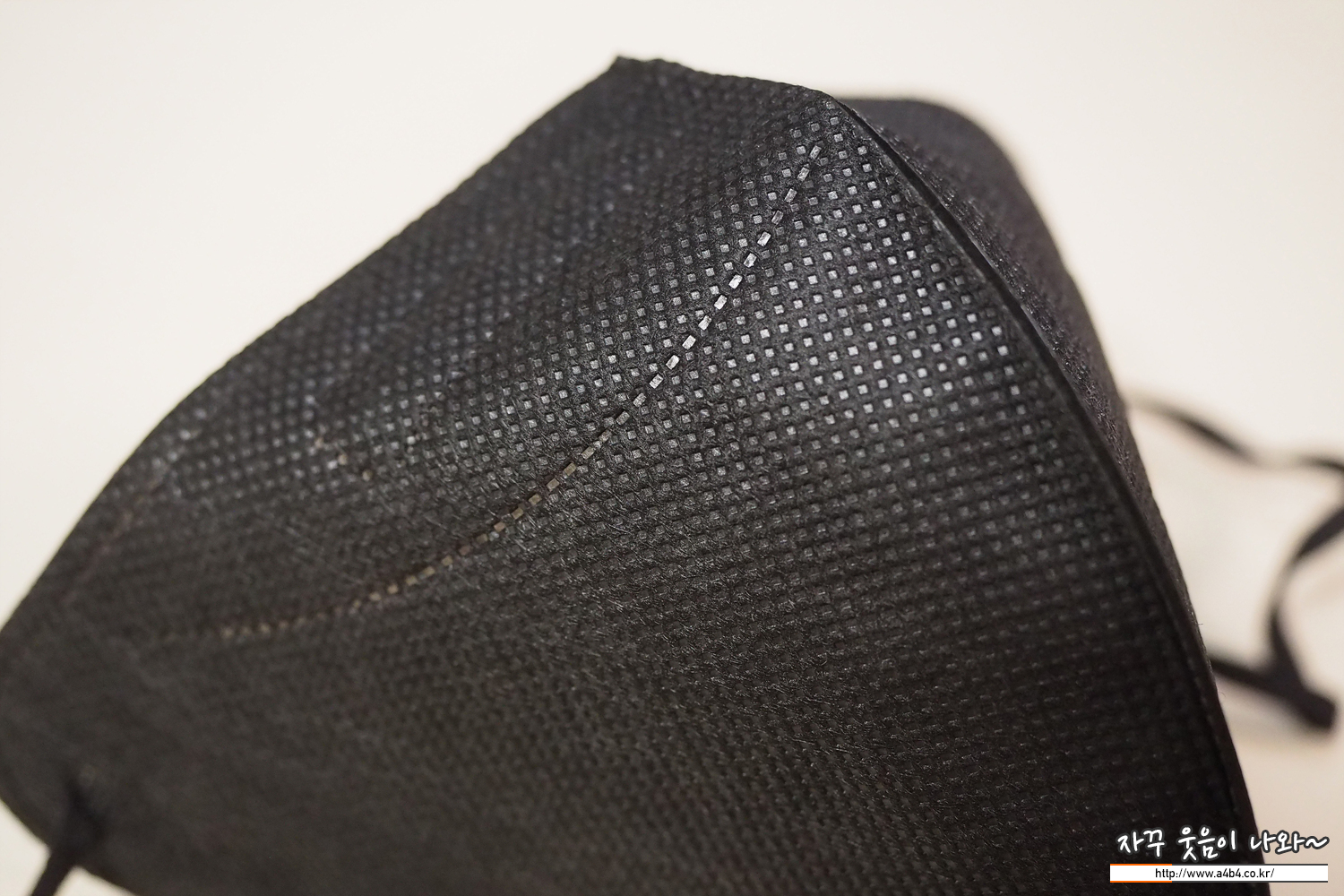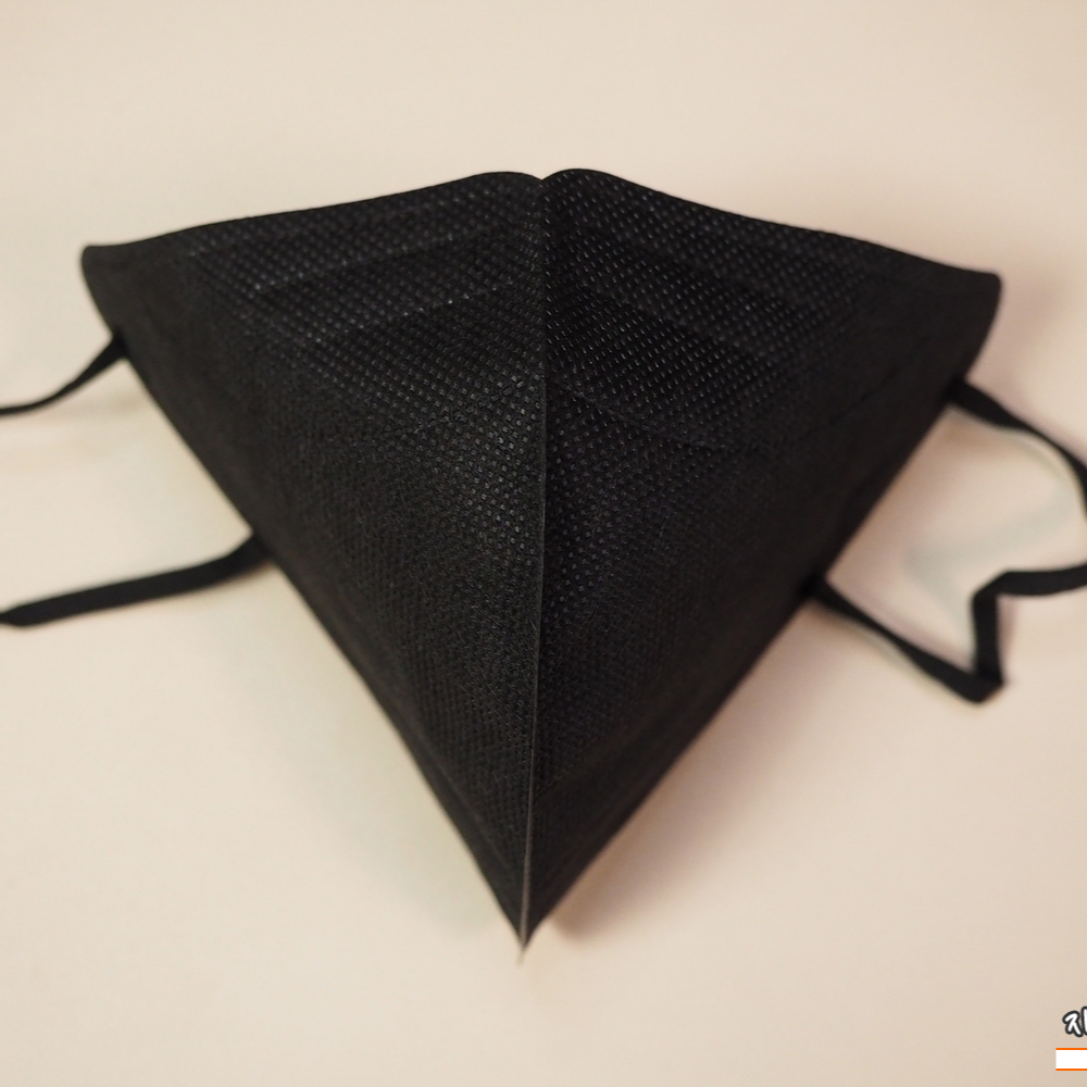 쿤달 마스크 블랙 겉감은 패턴 처리된 검정색 부직포가 사용되었습니다. 염색 상태는 무난하며 빛 반사에 민감한 유광블랙 발색을 보여주고 있습니다.
