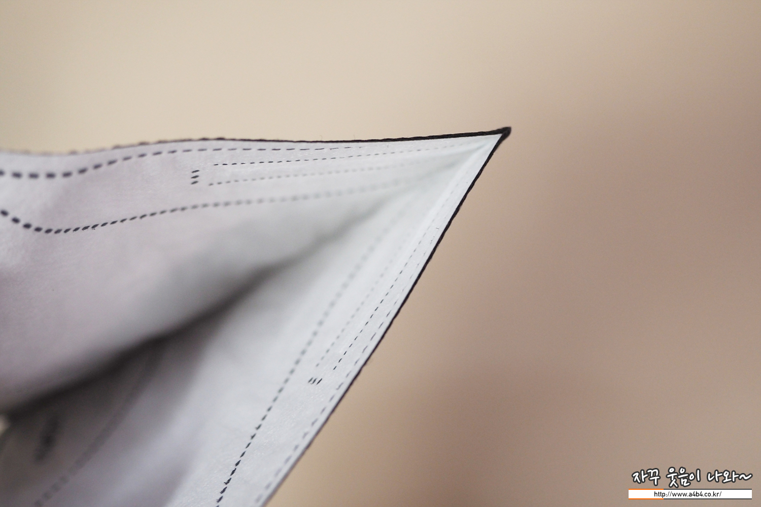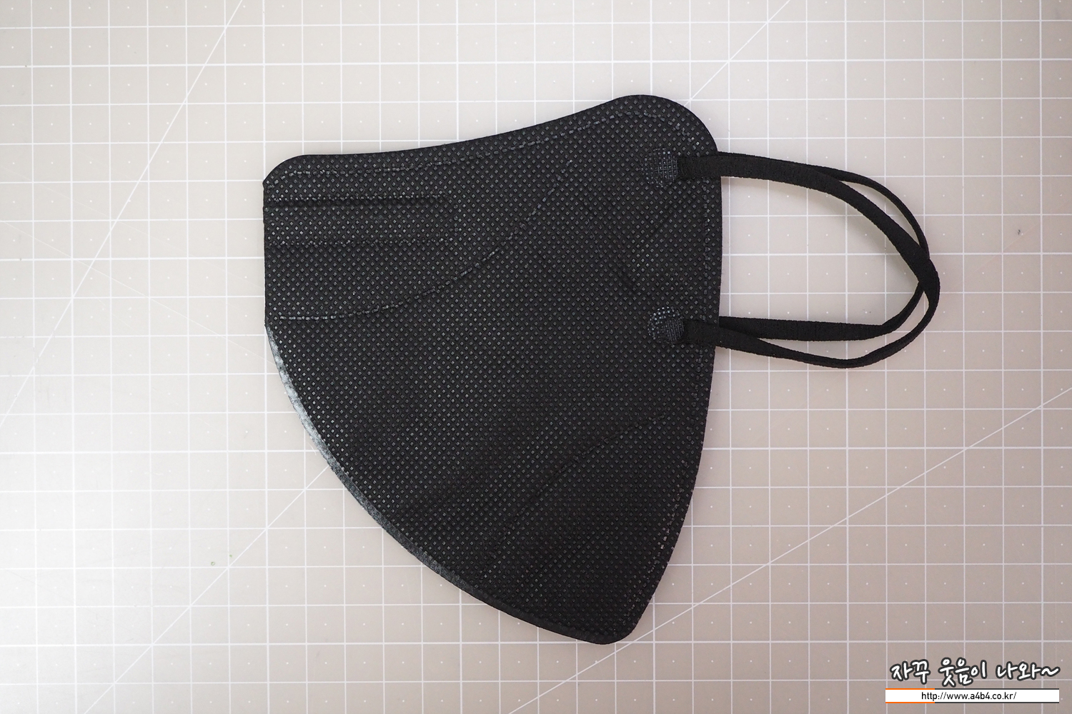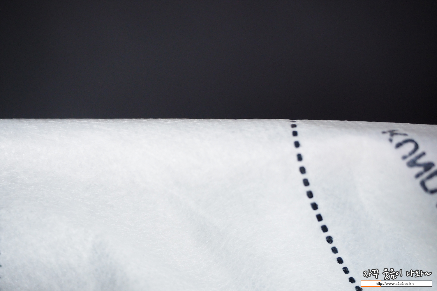 쿤달 마스크 블랙 겉감은 패턴 처리된 검정색 부직포가 사용되었습니다. 염색 상태는 무난하며 빛 반사에 민감한 유광블랙 발색을 보여주고 있습니다.