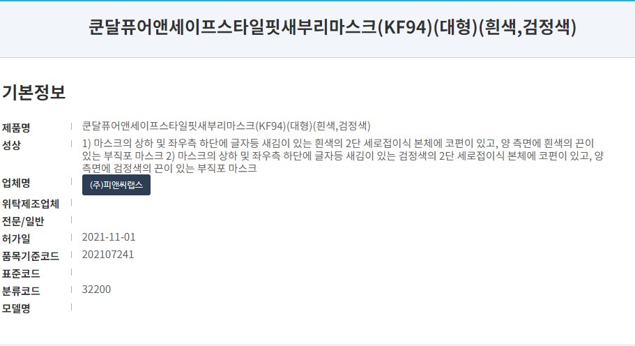 식약처 의약품안전나라에 등록되어있는 제품명칭은 '쿤달 퓨어앤세이프 스타일핏 새부리마스크'입니다. KF94 새부리형 제품으로 컬러는 힁색과 겅정색상이 있습니다. 21년 11월 허가된 마스크 마스크 제조사는 에티카 마스크로 잘 알려진 '피앤씨랩스'입니다.