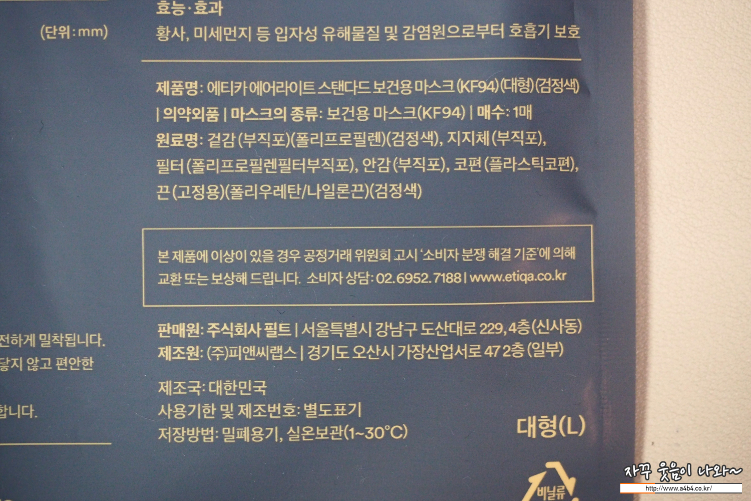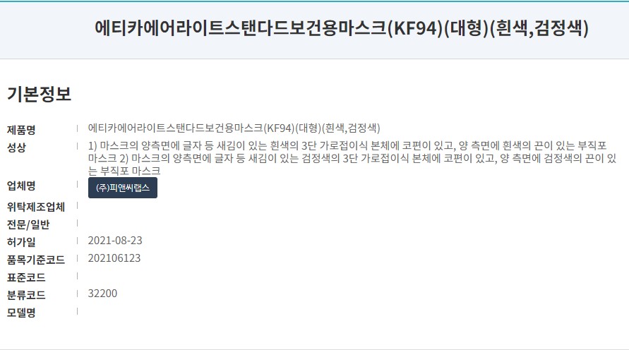 식약처 의약품안전나라 등록명은 '에티카 에어라이트 스탠다드 보건용마스크 (KF94)' 입니다. 사이즈는 대형 색상은 흰색과 검정색이 있으며 21년 8월 승인된 제품입니다. 제조사는 (주)피앤씨랩드, 판매원은 필트입니다.
