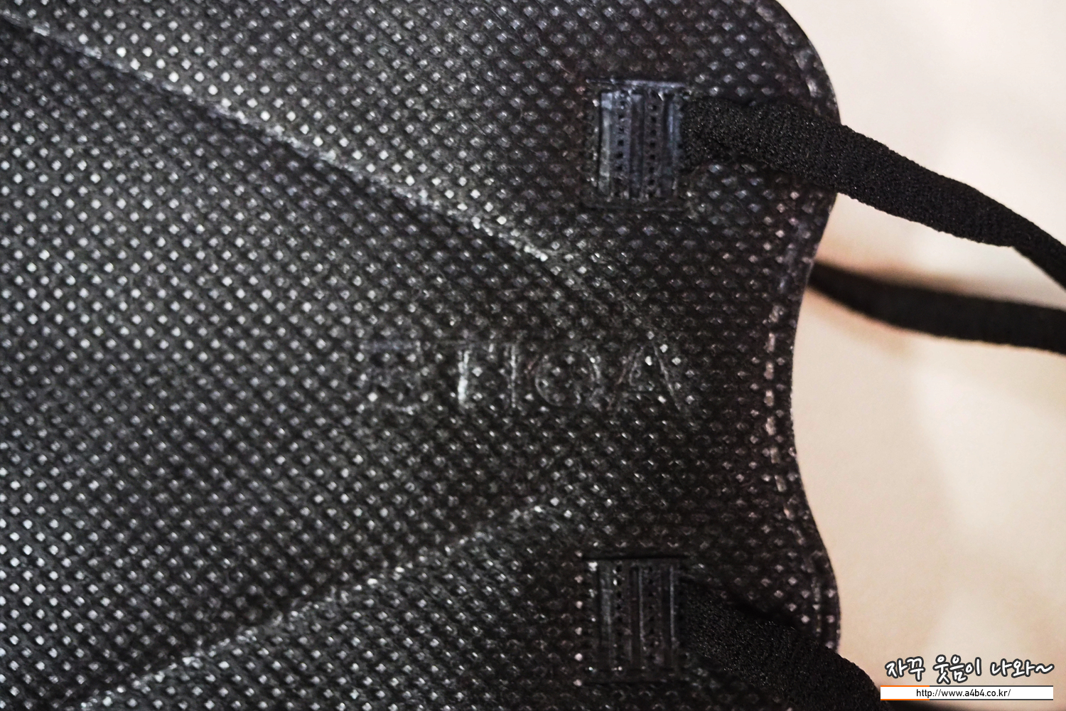 마스크 디자인은 일반적인 입체형마스크 디자인을 보입니다. 전면 오른쪽에는 제품명이 각인되어 있지만 다른 블랙마스크의 각인과 비슷하게 깔끔해 보이지는 않습니다.