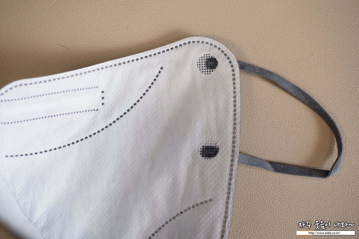 마스크 전면에는 납작한 디자인의 칼국수 이어밴드가 부착되어 있습니다. 이어밴드 탄력은 보통 수준이며 접착상태도 양호합니다. 또한 마스크 컬러와 잘 맞는 컬러로 부착되어 있네요.